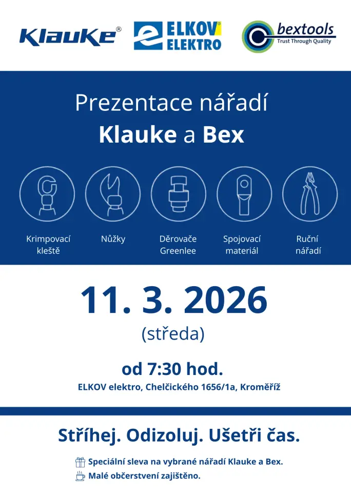 Zveme vás na profesionální prezentaci špičkového nářadí značek Klauke a Bex. Přijďte si vyzkoušet techniku, která vám usnadní každodenní práci, a využijte exkluzivní cenové nabídky připravené pouze pro tento den.