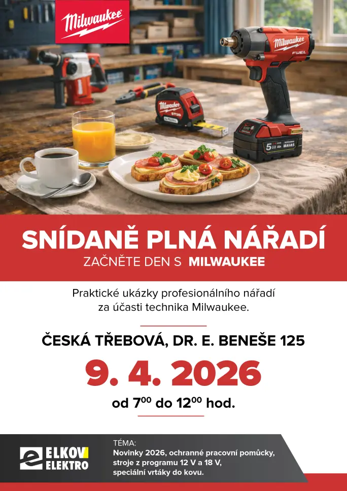 Zastavte se ve čtvrtek 9. 4. 2026 od 7:00 do 12:00 na naší pobočce v České Třebové. Čekají vás novinky od Milwaukee, odborné rady a praktické ukázky profesionálního nářadí za účasti technika Milwaukee a samozřejmě pořádná snídaně/občerstvení.