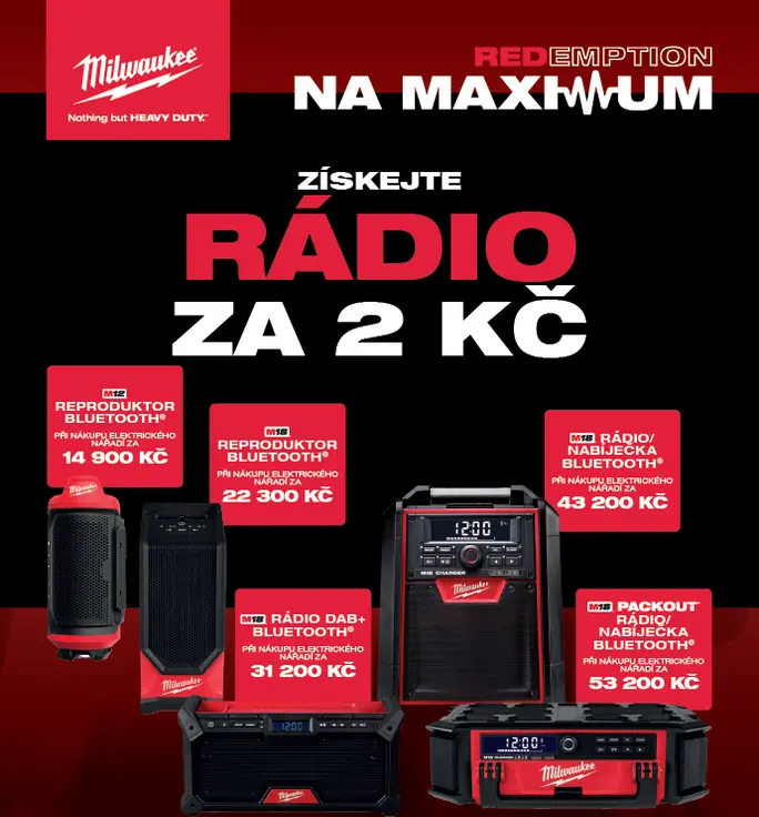- Kupte si elektrické nářadí MILWAUKEE od 2.3.-31.5.2026 a získejte reproduktor nebo rádio za 2 Kč.