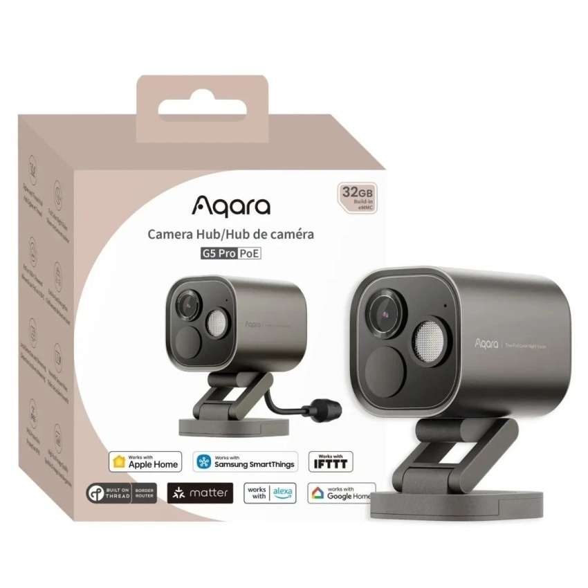 AQARA Camera Hub G5 Pro POE (CH-C03D) nabízí Quad HD rozlišení 2688×1520 s 1/1,8” snímačem chlazeným grafénem a clonou f/1,0 pro ostrý obraz i za šera. Kamera integruje Zigbee a Thread Border Router, funguje jako Matter Controller a Bridge, a podporuje lokální AI detekci tváří, vozidel, zvířat a zvuků. Připojuje se přes ethernetový port RJ45 s PoE napájením, disponuje 32GB eMMC úložištěm a je kompatibilní s Apple HomeKit Secure Video, Google Home, Amazon Alexa a Matter.