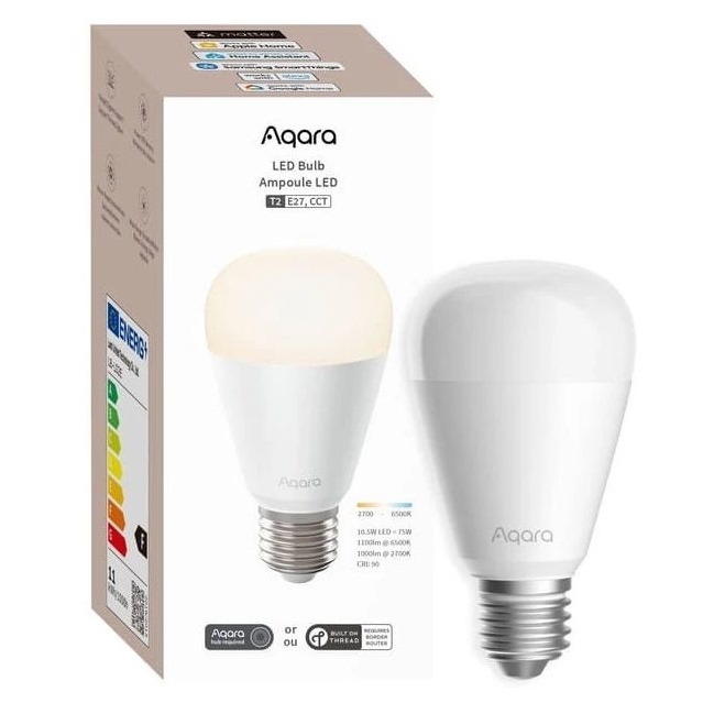 AQARA LED Bulb T2 (E27, CCT) nabízí široké spektrum barevné teploty od 2700 do 6500 K a jas 1100 lumenů při 6500 K. Podporuje bezdrátové protokoly Thread a Zigbee s možností snadného přepínání, což umožňuje integraci do různých chytrých domácností včetně Apple Home, Google Home a Alexa. Žárovka disponuje funkcí paměti posledního stavu, podporou adaptivního cirkadiánního osvětlení a možností vytváření automatizací v rámci ekosystému Aqara a dalších platforem.