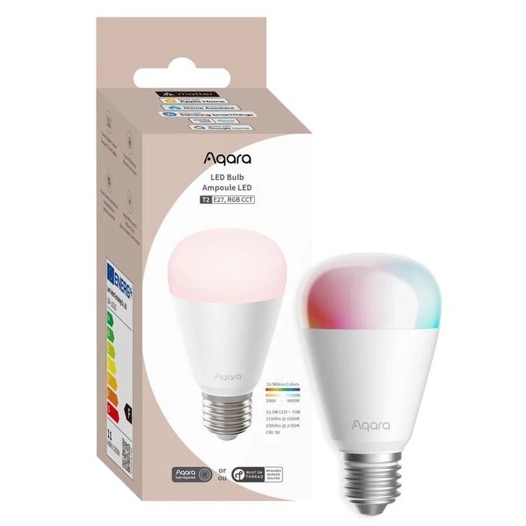 AQARA LED Bulb T2 (E27, RGB CCT) umožňuje snadné přepínání mezi protokoly Zigbee a Thread pro širokou kompatibilitu s chytrými domácnostmi. Žárovka poskytuje jas 1100 lm při 6500 K a nabízí barevnou teplotu od 2000 do 9000 K s možností výběru ze 16 milionů barev. Díky funkci uchování posledního stavu a podpoře cirkadiánního osvětlení zajišťuje komfortní a přizpůsobitelné osvětlení pro různé situace a denní doby.