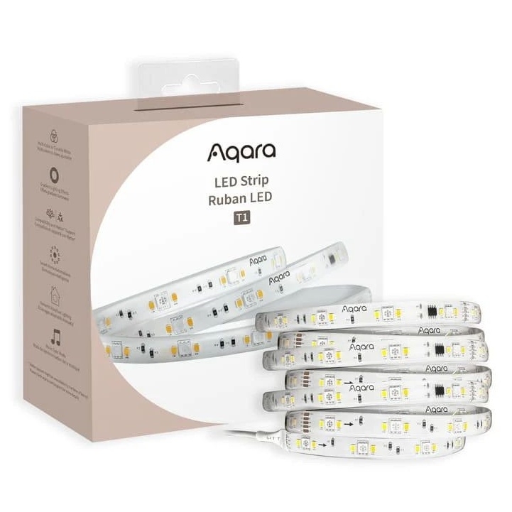 AQARA LED Strip T1 (RLS-K01D) nabízí vícebarevné osvětlení s RGBIC segmenty a laditelnou bílou v rozsahu 2700 K až 6500 K. Díky Zigbee 3.0 protokolu s funkcí opakovače a kompatibilitou s Matter umožňuje integraci do inteligentní domácí automatizace s dalšími zařízeními Aqara i třetích stran. Pás lze řezat po 20 cm segmentech a prodloužit až na 10 metrů, přičemž má krytí IP44 pro použití v interiéru i exteriéru.