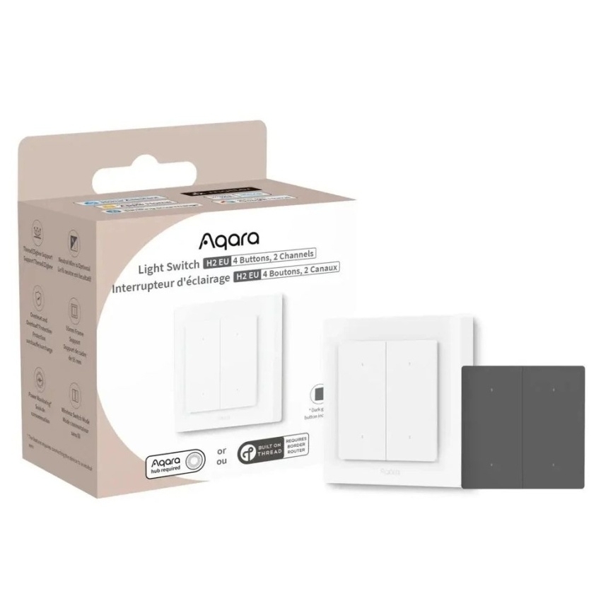 AQARA Light Switch H2 EU (WS-K08D) nabízí flexibilní ovládání díky dvěma relé a čtyřem tlačítkům, přičemž horní tlačítka ovládají relé a spodní slouží k bezdrátovému ovládání dalších zařízení, scén a automatizací. Vypínač podporuje komunikační protokoly Matter over Thread a Zigbee 3.0, což umožňuje integraci s různými chytrými domácími systémy a využití exkluzivních funkcí Aqara. Instalace je možná s nebo bez neutrálního vodiče a zařízení je kompatibilní se standardními 55 mm rámečky, včetně Gira System 55 a Merten M. Vypínač také monitoruje spotřebu energie a disponuje ochranou proti přetížení a přehřátí.