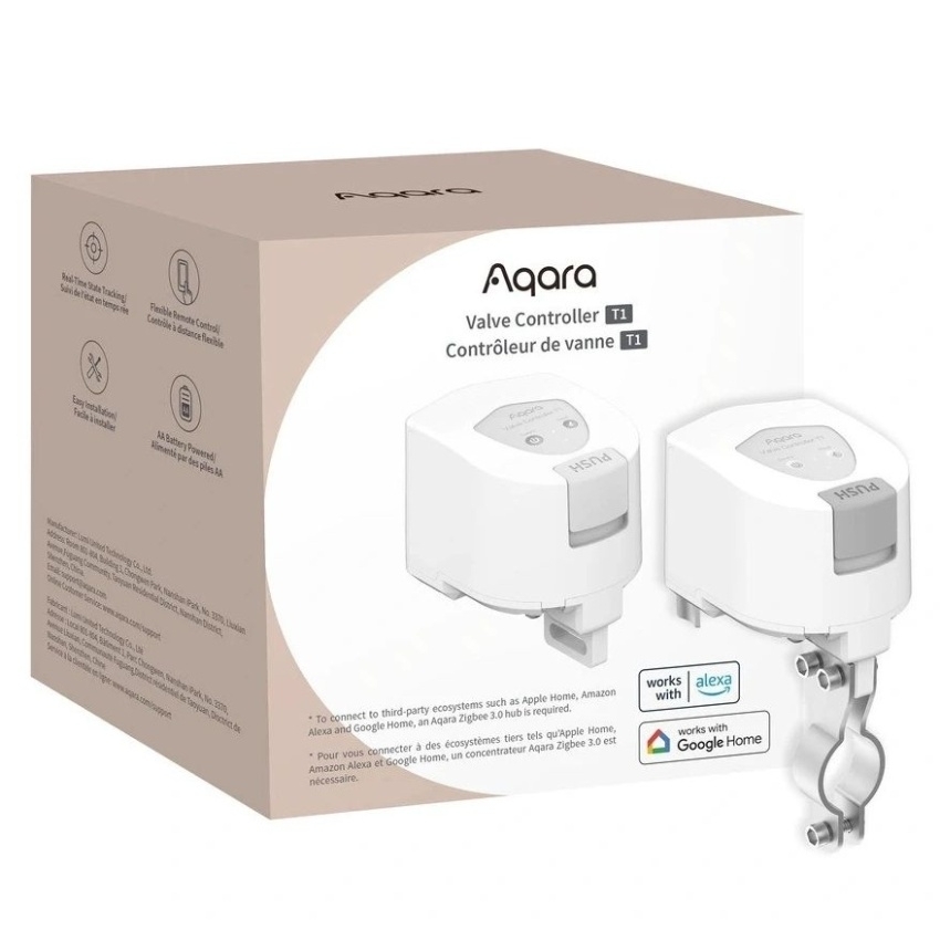 AQARA Valve Controller T1 (VC-X01D) umožňuje inteligentní ovládání vodovodních a plynových ventilů pomocí Zigbee 3.0 protokolu. Zařízení podporuje manuální ovládání tlačítkem i dálkové řízení přes aplikaci a integraci se senzory úniku vody či plynu, které automaticky uzavřou ventil do 5 až 20 sekund při detekci úniku. Instalace je jednoduchá bez nutnosti zásahu do potrubí a ovladač je kompatibilní s pákovými a motýlkovými rukojeťmi ventilů DN15, DN20 a DN25. Napájen je čtyřmi AA bateriemi s výdrží až 2 roky.