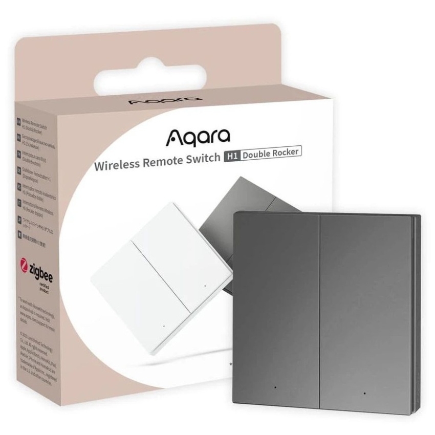 AQARA Wireless Remote Switch H1 Double Rocker (WRS-R02-G) je bezdrátový dálkový spínač s dvěma tlačítky, který komunikuje přes Zigbee 3.0 protokol. Zařízení umožňuje ovládání světel a dalších chytrých zařízení pomocí jednoho kliknutí, dvojkliku nebo přidržení tlačítka. Napájí se baterií CR2450 s výdrží až 2 roky a je kompatibilní s Aqara Hub EU verzí, podporuje integraci do Apple HomeKit prostřednictvím Aqara Hubu. Vypínač má rozměry 85.8 × 86 × 12.5 mm a je určen pro použití v interiéru bez potřeby kabeláže.