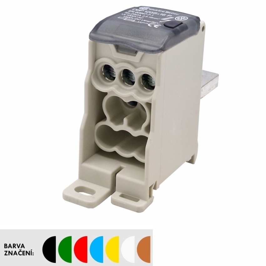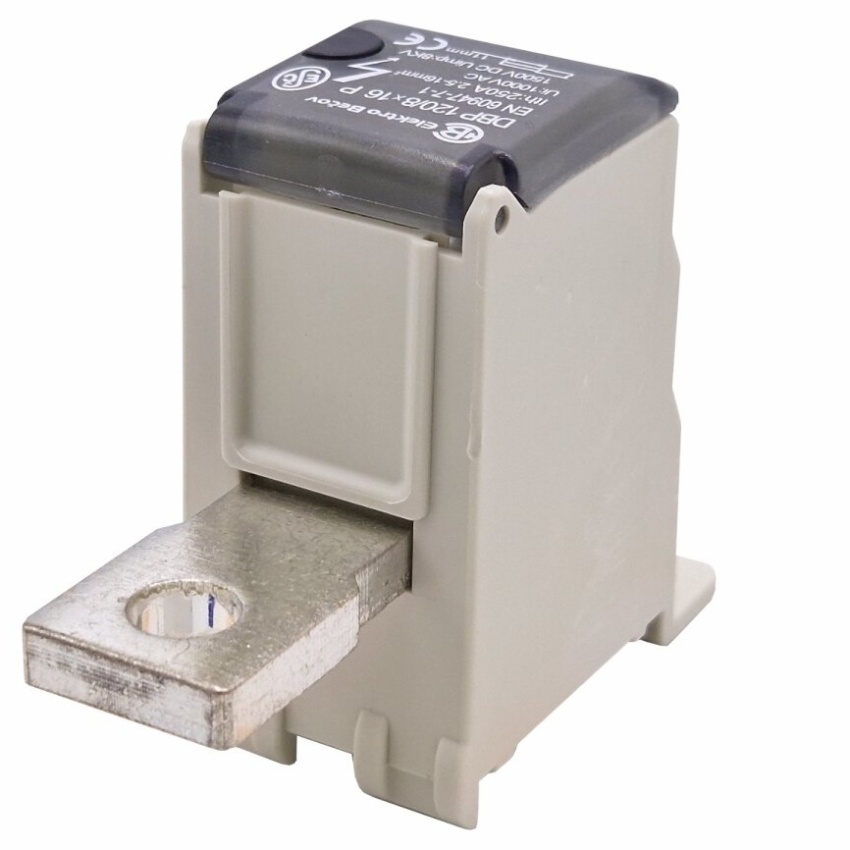 Distribuční blok ELEKTRO BEČOV DBP 120/8x16 P má vstupní pin M8, jmenovitý proud 250 A a výstup 8x 16 mm². Jmenovité napětí činí 1000 V AC / 1500 V DC.