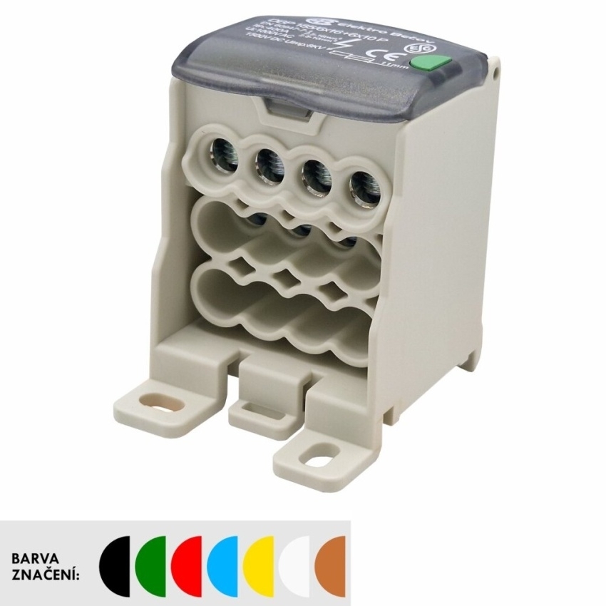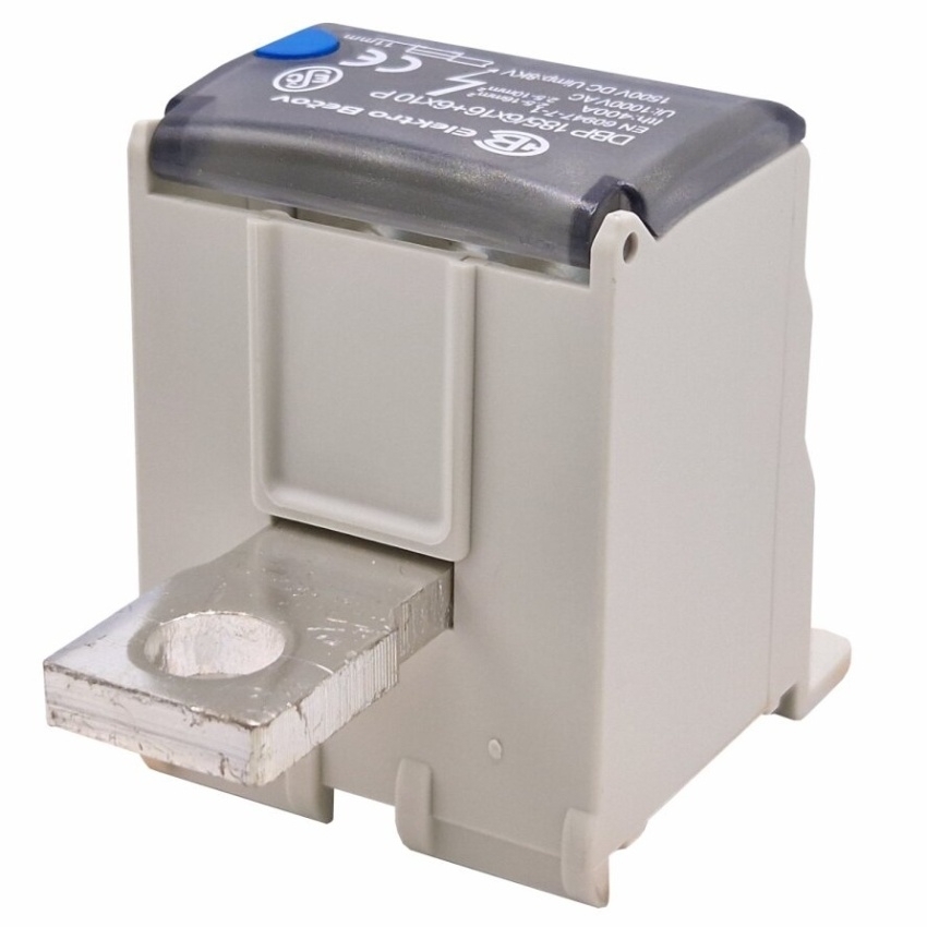 Distribuční blok ELEKTRO BEČOV DBP 185/6x16+6x10 P má vstupní pin M10, jmenovitý proud 400 A a výstup 6x 16 + 6x 10 mm². Jmenovité napětí činí 1000 V AC / 1500 V DC.