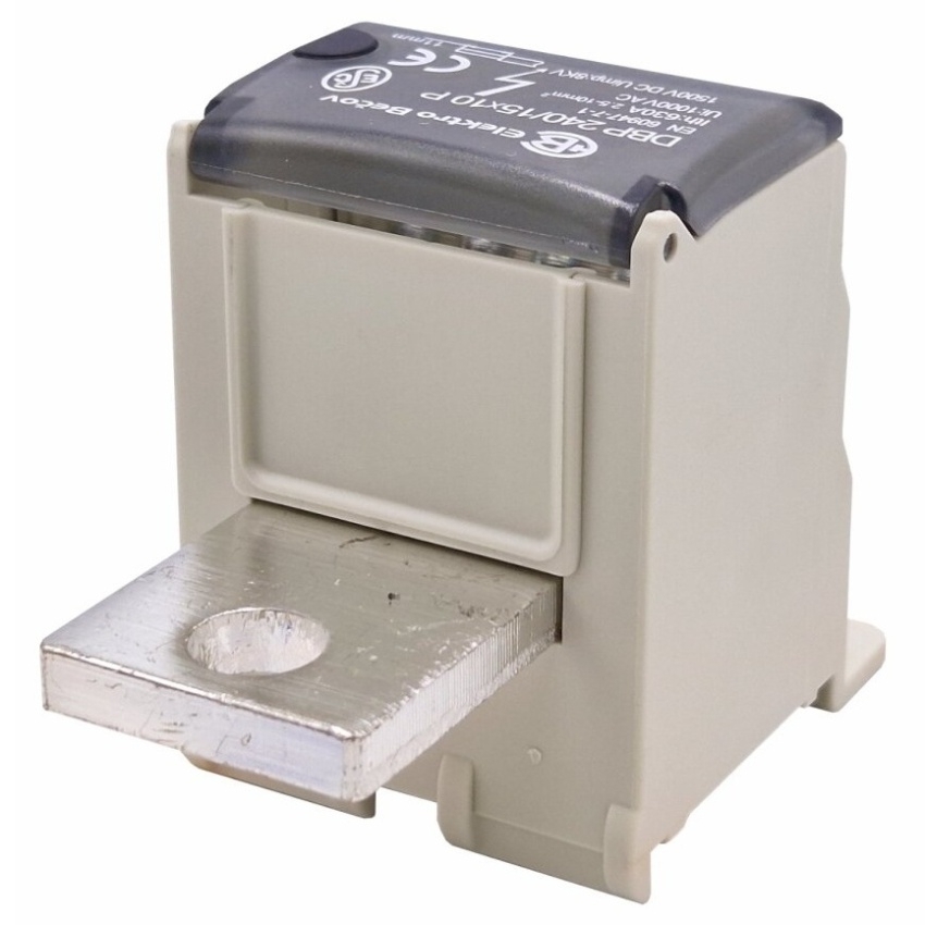 Distribuční blok ELEKTRO BEČOV DBP 240/3x50 P má vstup M10, jmenovitý proud 630 A a výstup 3x 50 mm². Jmenovité napětí činí 1000 V AC / 1500 V DC.