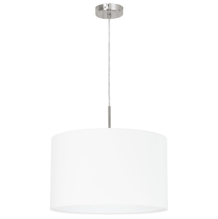 Toto závěsné svítidlo ze série PASTERI je vyrobeno ze saténově niklové oceli a látky v bílé barvě. Bodové světlo potřebuje žárovku E27.
