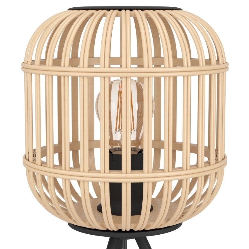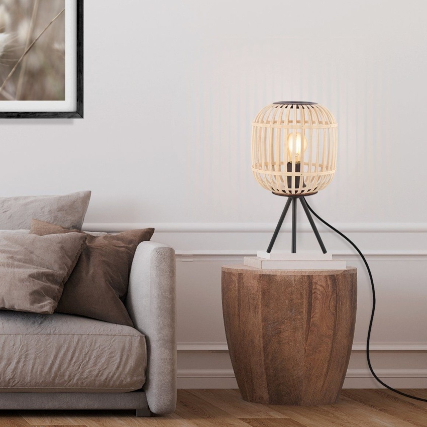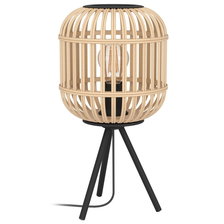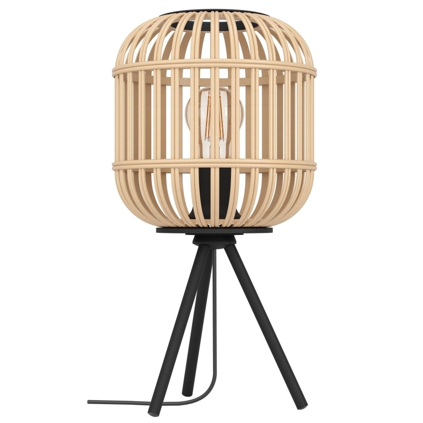 Stolní svítidlo Eglo BORDESLEY s černou kovovou trojnožkou a stínidlem z přírodního bambusu.