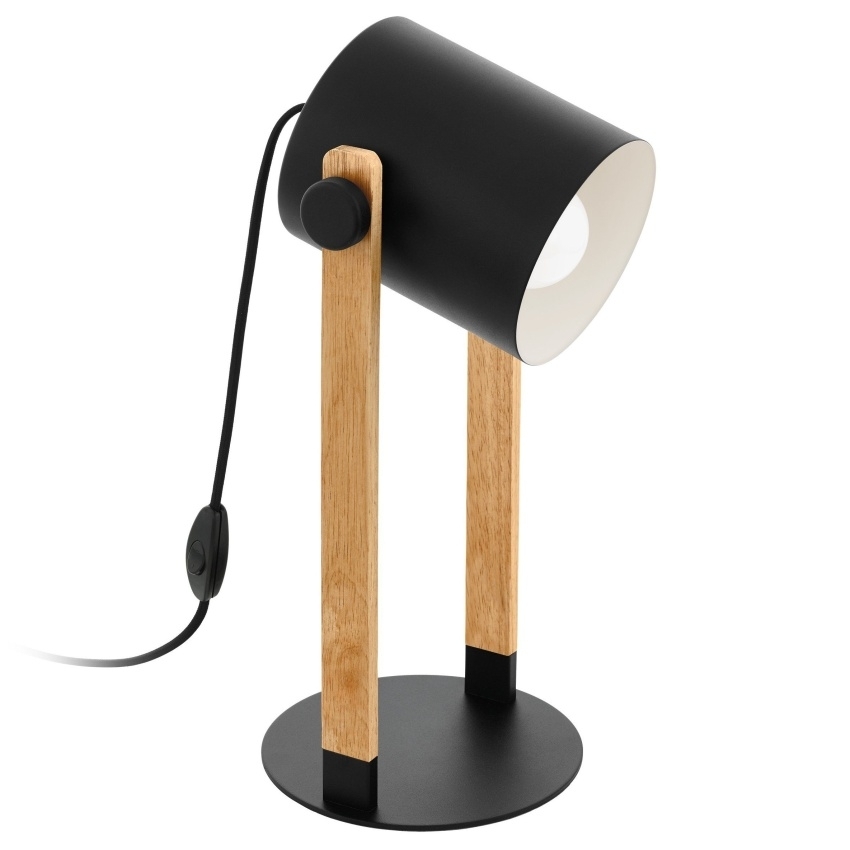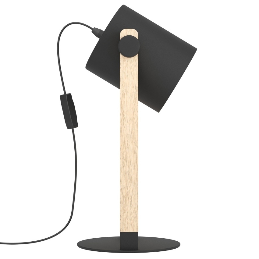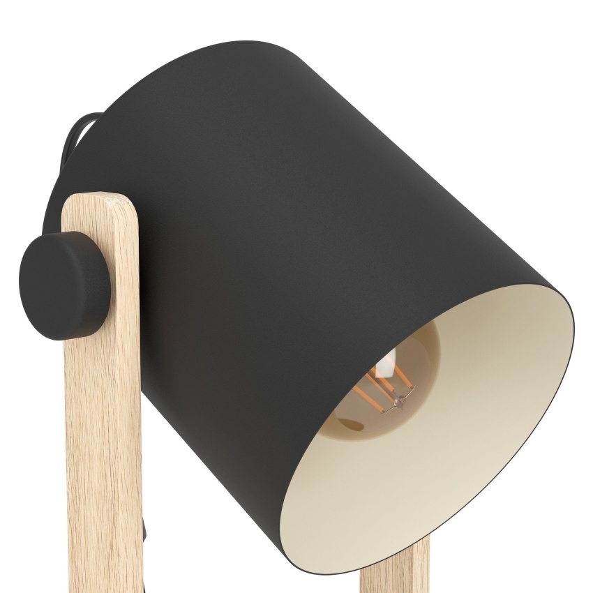 Stolní svítidlo Eglo HORNWOOD v kombinaci černého kovu, krémových detailů a přírodního borovicového dřeva.