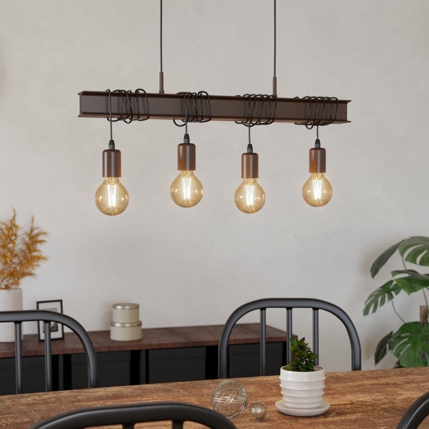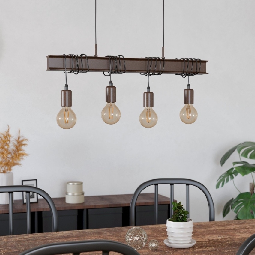 Závěsné svítidlo EGLO TOWNSHEND 4 přináší industriální design v antické hnědé barvě. Díky dlouhým kabelům lze každou žárovku spustit do jiné výšky a vytvořit tak originální a jedinečný vzhled osvětlení. Skvěle se hodí do kuchyně, jídelny, obývacího pokoje, ložnice či pracovny a zajímavě doplní i vstupní halu, chodbu nebo schodiště. Žárovky s paticí E27 nejsou součástí balení.