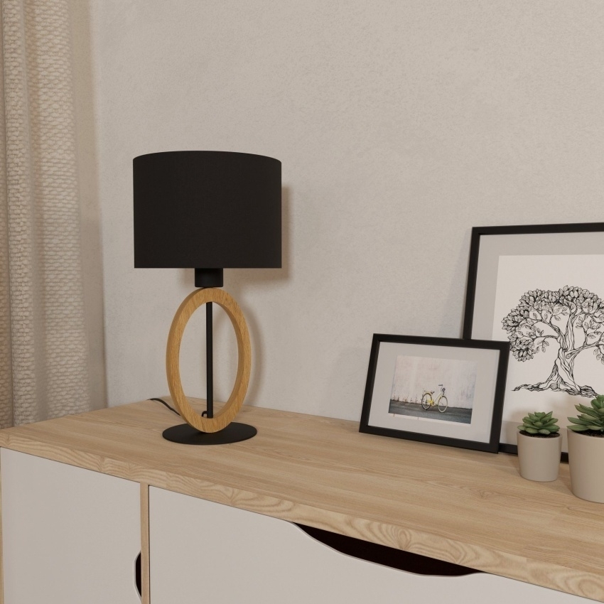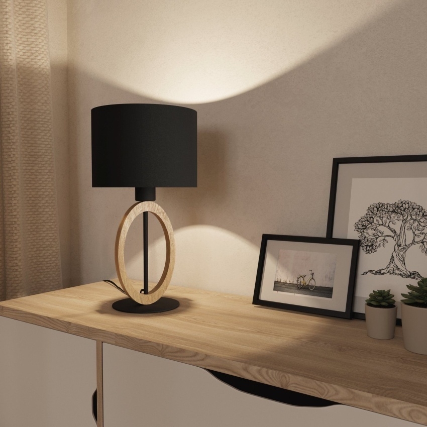 Stolní svítidlo EGLO BASILDON 1 zaujme svou kombinací materiálů a kontrastních barev. Elegantní černé textilní stínidlo je doplněno o kovové a dřevěné prvky v černé a hnědé barvě, které svítidlu dodávají moderní a zároveň přírodní vzhled. Hodí se na noční stolek, pracovní stůl, komodu nebo odkládací stolek a poskytuje jak dostatek světla na čtení, tak příjemné intimní osvětlení. Žárovka není součástí balení.