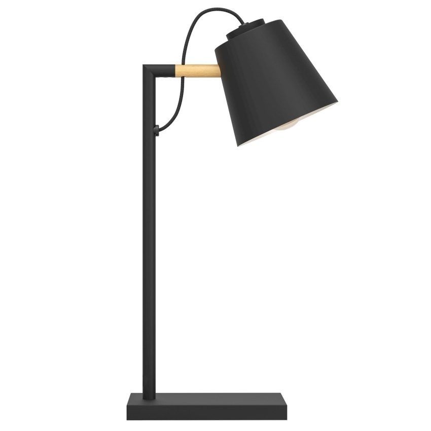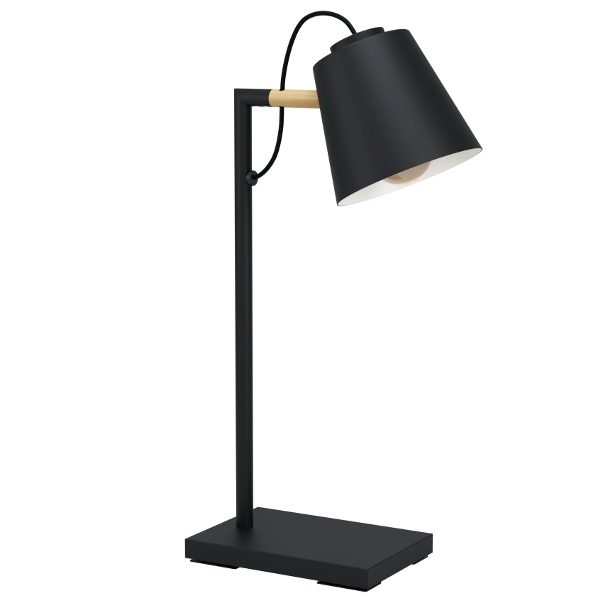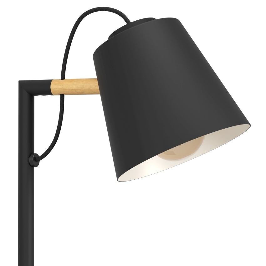 Stolní svítidlo EGLO LACEY s kombinací černé barvy a přírodního dřeva pro moderní interiéry.