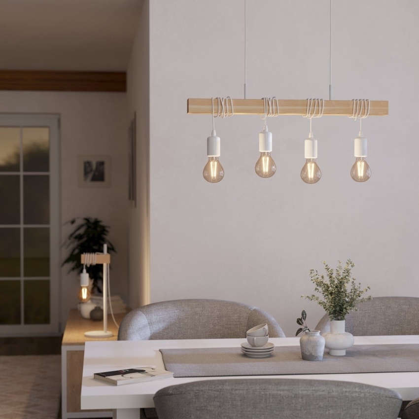 Závěsné svítidlo EGLO TOWNSHEND zaujme elegantní kombinací bílé barvy a hnědého dřeva. Díky svému jednoduchému, ale stylovému designu se skvěle hodí nad jídelní nebo pracovní stůl, do kuchyně, obývacího pokoje či ložnice. Otevřená konstrukce umožňuje, aby žárovky vynikly jako součást designu, a jejich výběr tak ovlivní celkový vzhled svítidla. Lustr má délku 70 cm a je vybaven čtyřmi paticemi E27 pro žárovky s maximálním výkonem 60 W.