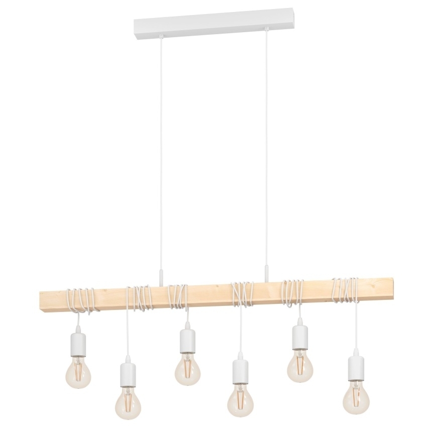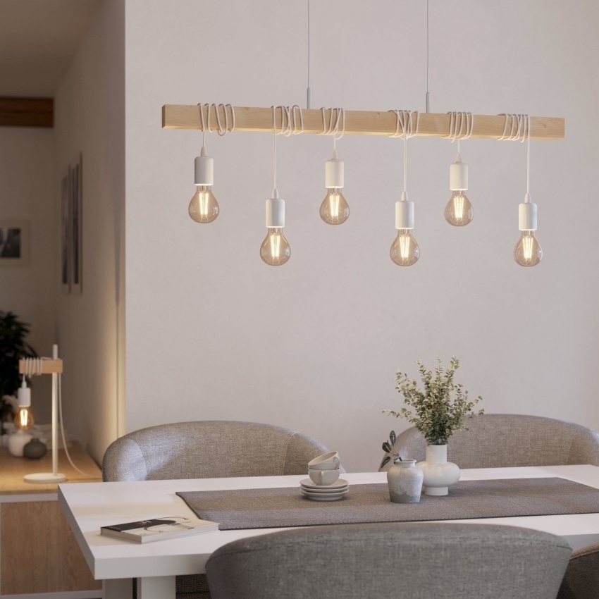 Závěsné svítidlo EGLO TOWNSHEND spojuje eleganci bílé barvy s přírodním hnědým dřevem. Díky svému čistému a stylovému vzhledu se hodí nad jídelní stůl, pracovní plochu, do kuchyně či obývacího pokoje. Otevřený design umožňuje, aby žárovky vynikly jako součást celkového vzhledu svítidla. Lustr má délku 100 cm a nabízí šest patic E27 pro žárovky s maximálním výkonem 60 W. Vhodný pro osvětlení větších prostor, kde vytváří příjemnou a útulnou atmosféru.