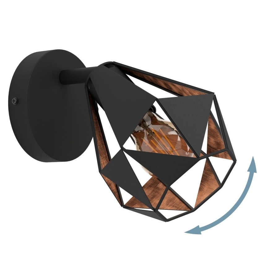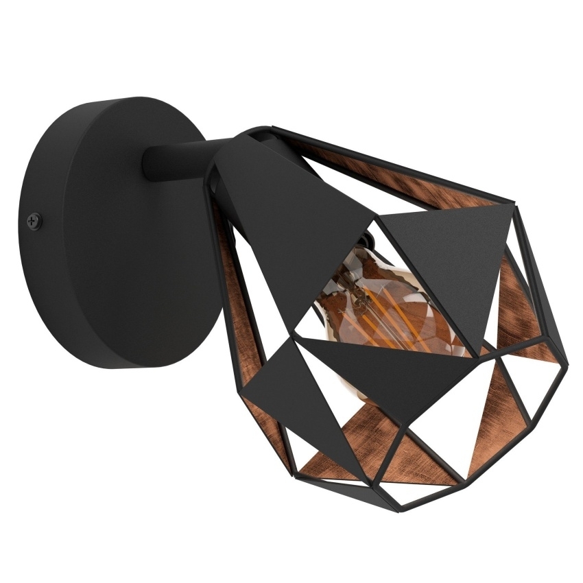 Moderní nástěnné svítidlo EGLO CARLTON 7 v černé barvě s měděným antickým vnitřkem a geometrickým designem stínidla.