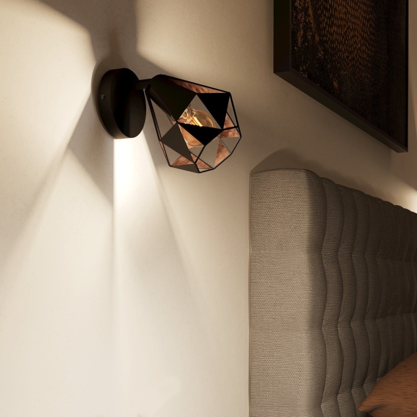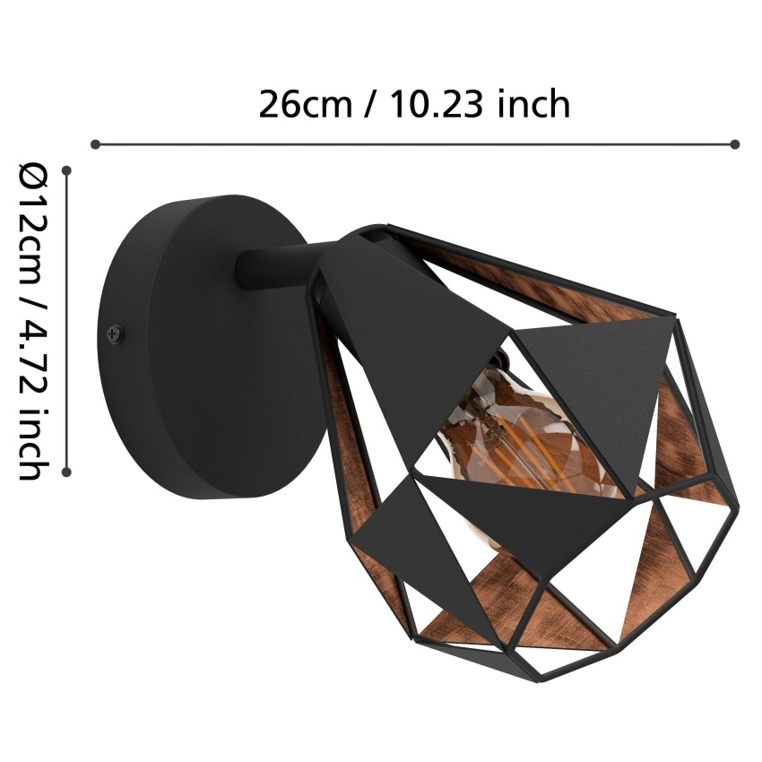 Nástěnné svítidlo EGLO CARLTON 7 kombinuje elegantní černý kov s měděným antickým vnitřkem, který vytváří teplý a příjemný světelný efekt. Díky geometrickému tvaru stínidla ve formě diamantu promítá světlo fascinující vzory na stěnu. Svítidlo je ideální do obývacího pokoje, ložnice, jídelny nebo chodby, kde dodá interiéru moderní a stylový vzhled. Je určeno pro žárovku s paticí E27 a maximálním výkonem 40 W.