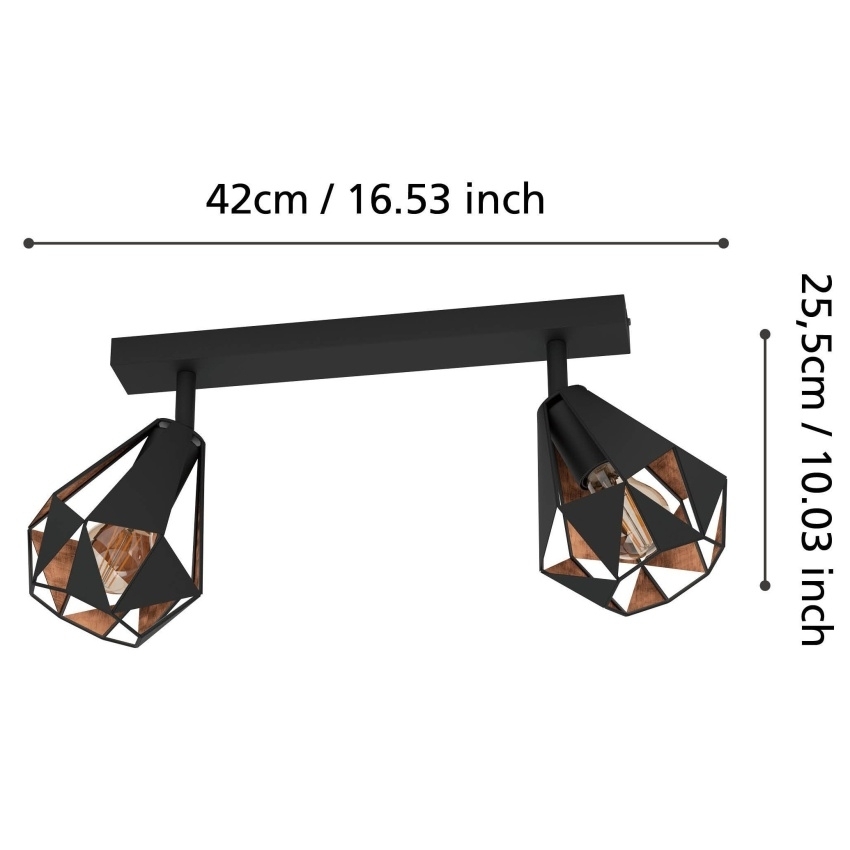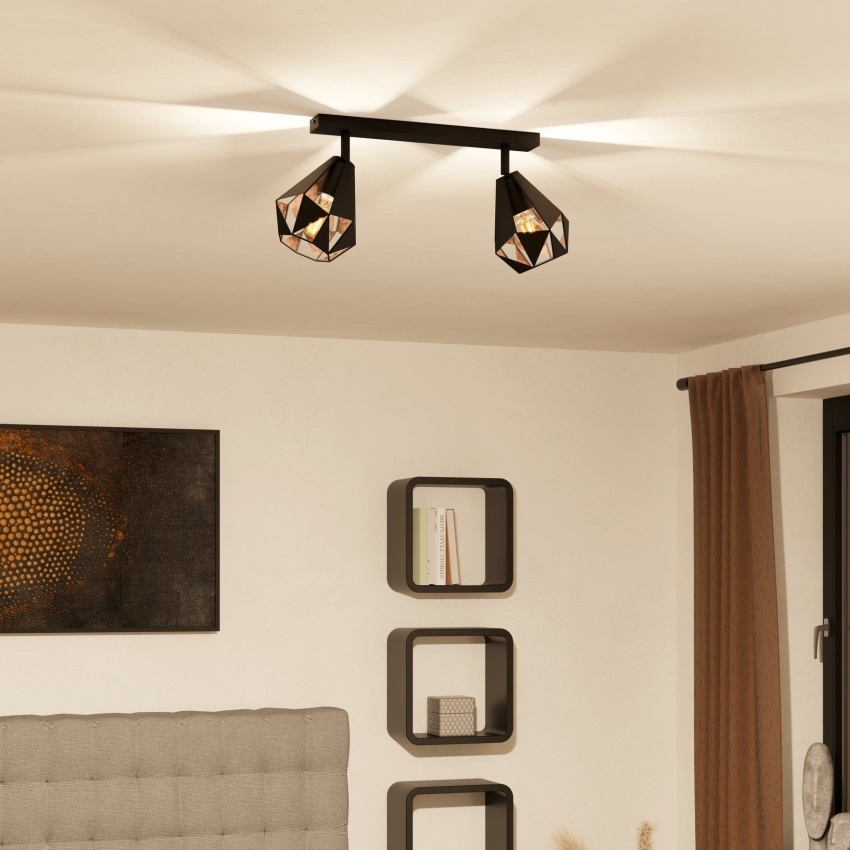 Stropní svítidlo EGLO CARLTON 7 přináší do interiéru moderní design s industriálním nádechem. Dvě stínidla ve tvaru kosočtverce v černém provedení s měděným antickým vnitřkem vytvářejí fascinující hry světla a stínu. Pohyblivé hlavy umožňují směrovat světlo přesně tam, kde je potřeba. Svítidlo je ideální pro kuchyň, obývací pokoj, ložnici nebo chodbu a je kompatibilní s žárovkami s paticí E27 do výkonu 40 W.