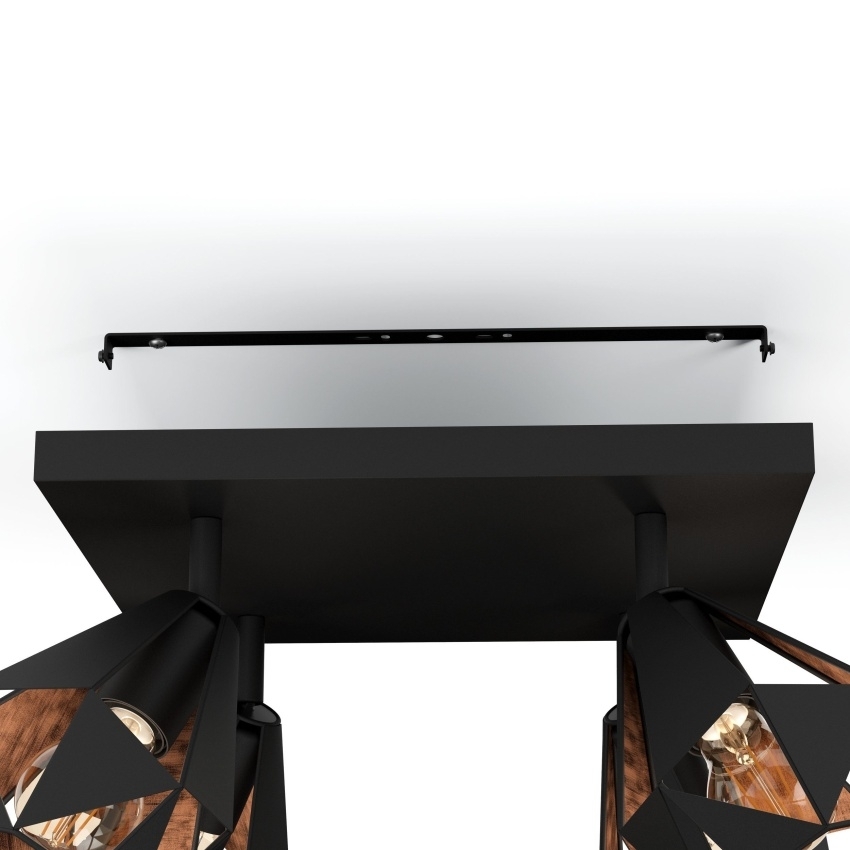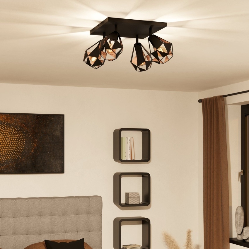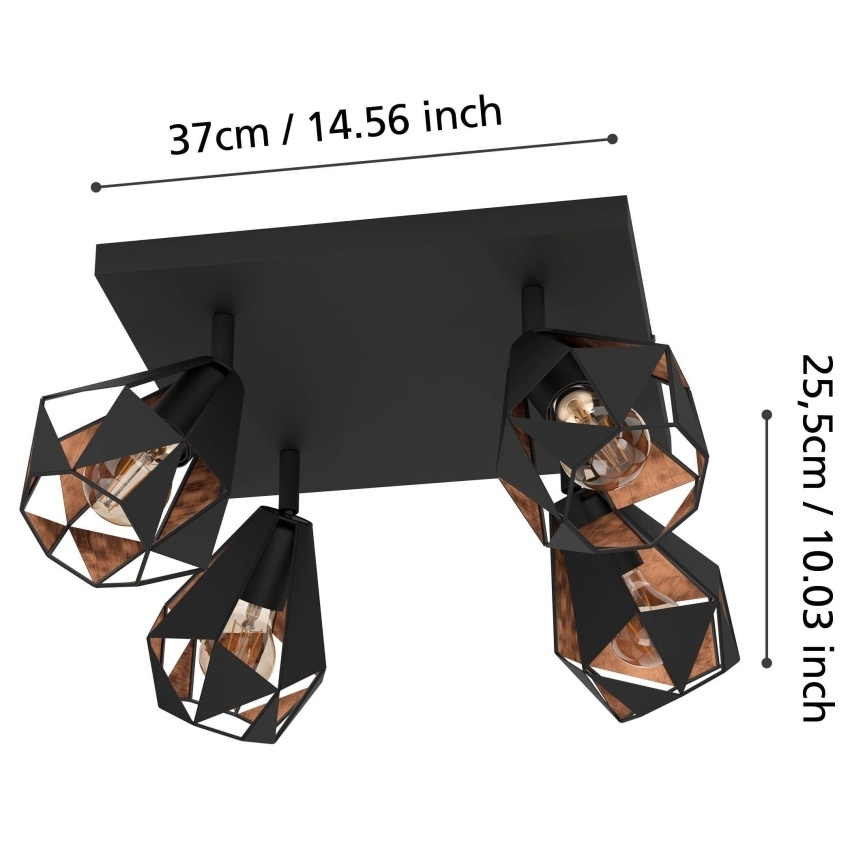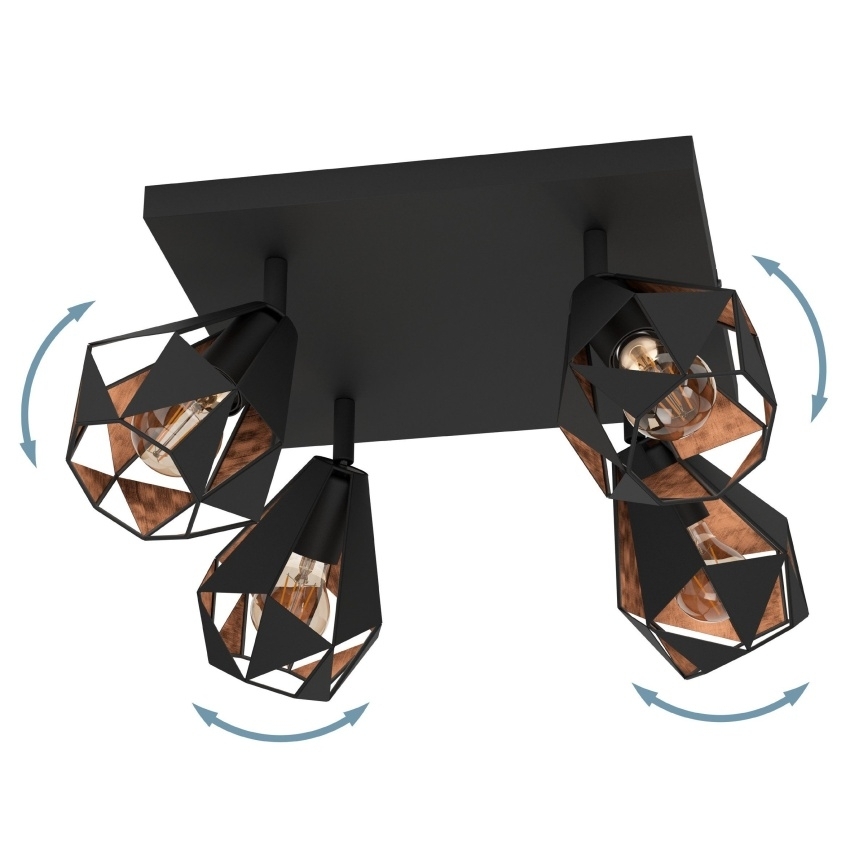 Stropní svítidlo EGLO CARLTON 7 vyniká kombinací černého kovu a měděného antického vnitřku stínidel. Čtyři pohyblivá stínidla ve tvaru kosočtverce umožňují nasměrovat světlo dle potřeby a vytvářejí fascinující světelné efekty díky geometrickým otvorům. Svítidlo je ideální pro kuchyň, obývací pokoj, ložnici či chodbu. Je určeno pro žárovky s paticí E27 a maximálním výkonem 40 W.