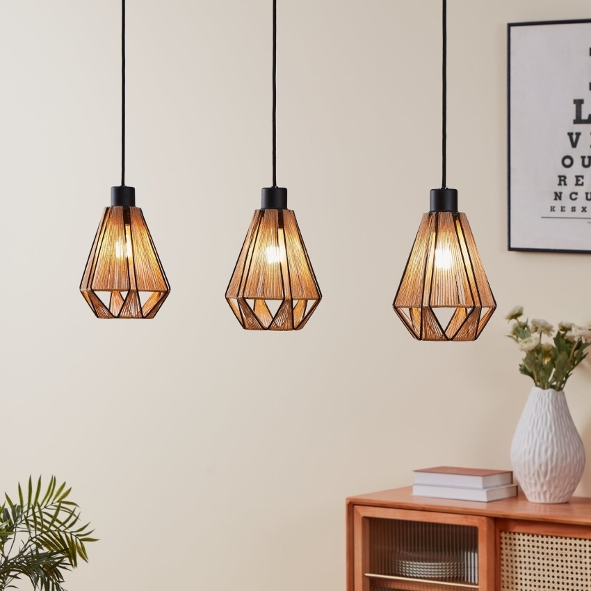 Závěsné svítidlo EGLO ADWICKLE přináší do interiéru moderní design v kombinaci s přírodními prvky. Tři černá kovová stínidla ve tvaru diamantu jsou omotána konopnou přízí v přírodní barvě, která po rozsvícení vytváří jedinečný světelný efekt. Stínidla jsou zavěšena na podlouhlém černém kovovém přístřešku, díky čemuž je svítidlo ideální pro osvětlení jídelního stolu či obývacího pokoje. Žárovky s paticí E27 nejsou součástí balení a lze je zvolit podle vlastních preferencí.