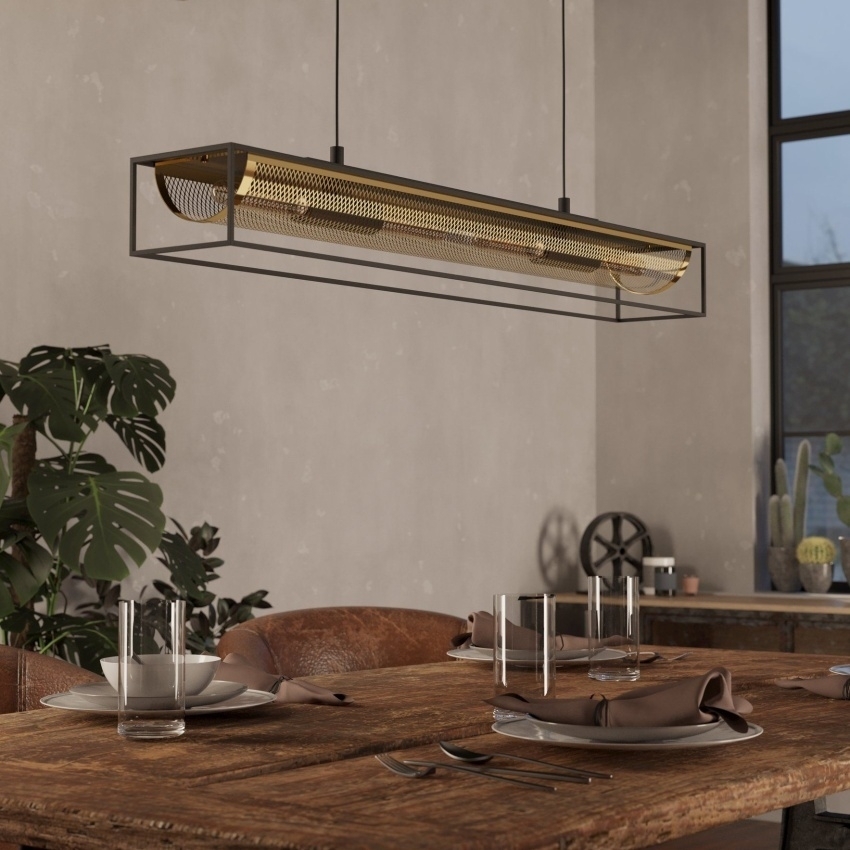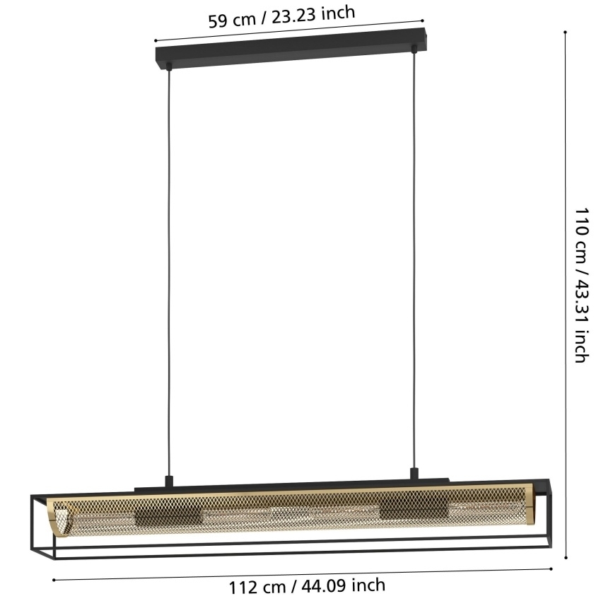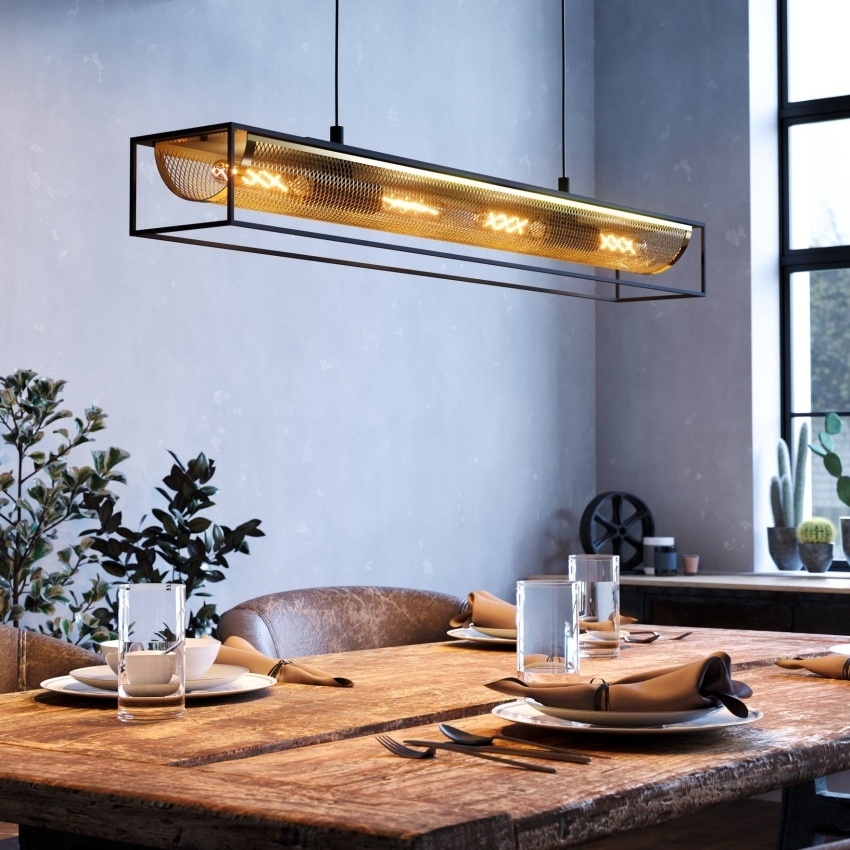 Závěsné svítidlo EGLO NOHALES je designovým kouskem, který zaujme svou kombinací černého kovového rámu a mosazné drátěné sítě. Průhledná konstrukce nechává vyniknout čtyřem vnitřním žárovkám, jejichž světlo vytváří jedinečnou hru stínů. Díky svému industriálnímu stylu se skvěle hodí do moderních i klasických interiérů, zejména nad jídelní stůl, barový pult nebo do obývacího pokoje. Svítidlo je vhodné pro podlouhlé žárovky s paticí E27, které nejsou součástí balení.