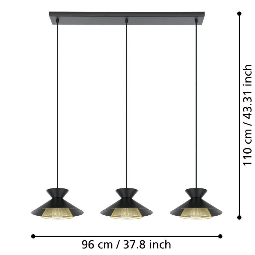 Závěsné svítidlo GRIZEDALE od EGLO je elegantní kombinací moderního designu a luxusních materiálů. Skládá se ze tří černých kovových stínidel, z nichž každé obsahuje vnitřní prvek z jemné mosazné sítě, která vytváří působivý světelný efekt. Stínidla v japonském stylu jsou zavěšena na černém podlouhlém kovovém vrchlíku, díky čemuž je svítidlo ideální nad delší jídelní stůl nebo do prostorného obývacího pokoje. Svítidlo se skvěle hodí do moderních interiérů a stane se výrazným dekorativním prvkem. Žárovky nejsou součástí balení, lze použít jakýkoliv typ s paticí E27.
