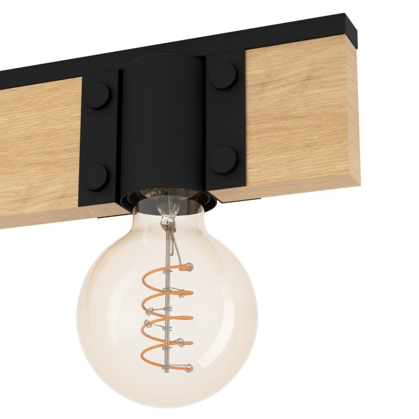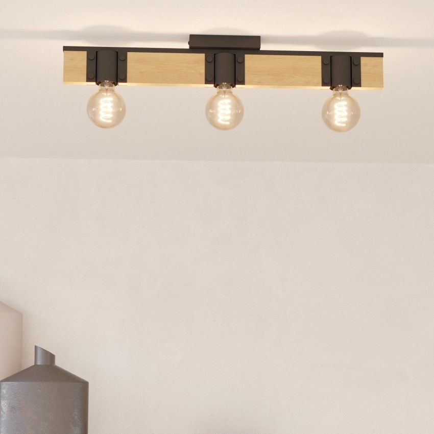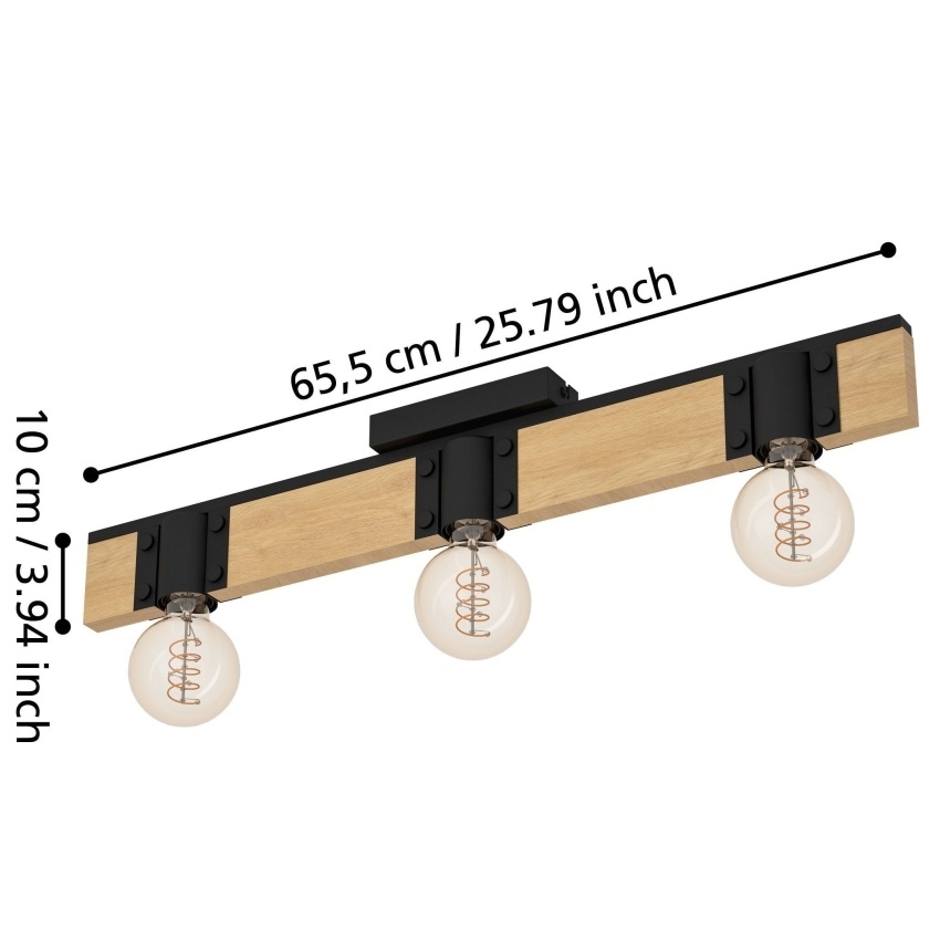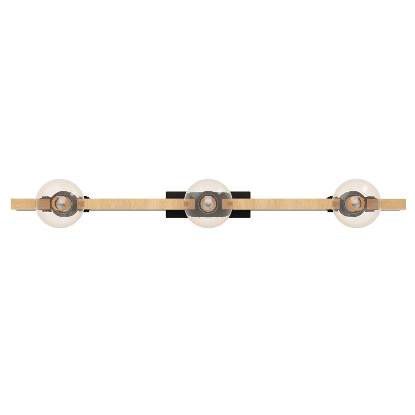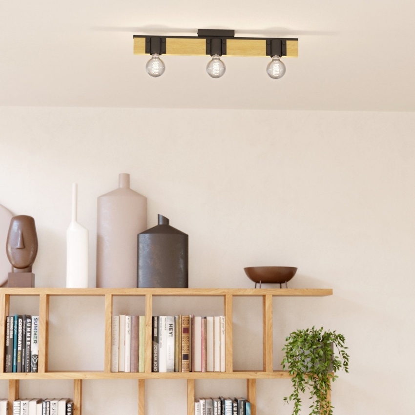 Stropní svítidlo BAILRIGG od EGLO spojuje přírodní masivní dřevo s moderním černým kovem, čímž vytváří stylový a minimalistický vzhled. Obdélníková dřevěná lišta slouží jako základna pro tři černé kovové držáky lamp, které nabízejí možnost použití různých typů žárovek s paticí E27. Svítidlo je ideální pro moderní interiéry a skvěle se hodí do obývacího pokoje, jídelny, kuchyně či ložnice. Díky svému trendy materiálovému mixu působí přirozeně a zároveň elegantně. Žárovky nejsou součástí balení.
