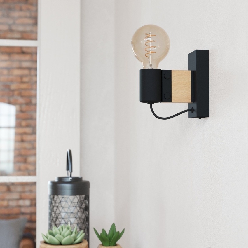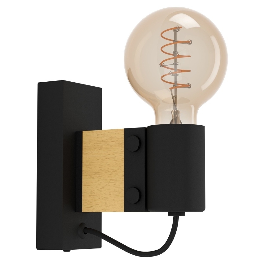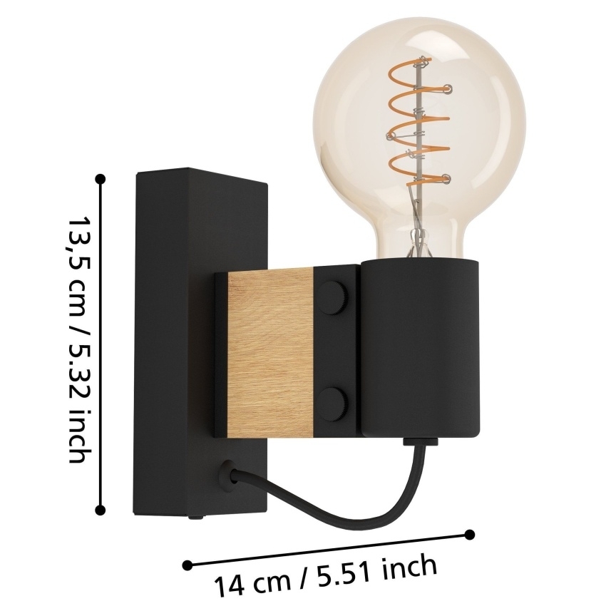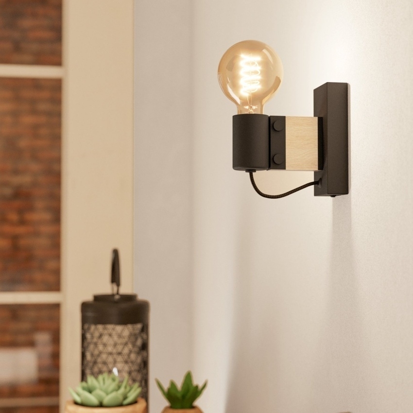 Nástěnné svítidlo BAILRIGG od EGLO spojuje přírodní masivní dřevo s moderním černým kovem, čímž vytváří elegantní a minimalistický vzhled. Obdélníkový dřevěný prvek slouží jako základna pro vertikální kovový držák žárovky. Toto stylové svítidlo se skvěle hodí do puristických interiérů a stane se jedinečným designovým prvkem vaší stěny. Díky patici E27 je možné použít různé typy žárovek podle vašich preferencí. Žárovka není součástí balení.