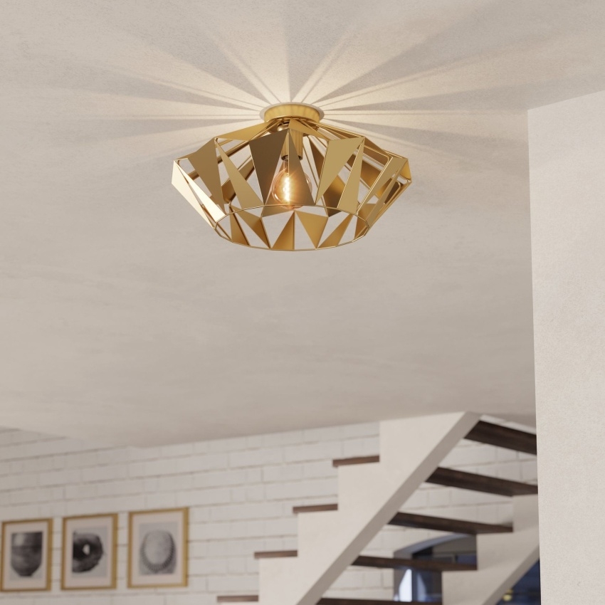 Stropní svítidlo CARLTON od EGLO zaujme svým elegantním designem s kovovým tělem ve tvaru diamantu v luxusním zlatém provedení. Geometrická konstrukce stínidla vytváří po rozsvícení jedinečnou hru světla a stínů, která dodá interiéru stylovou atmosféru. Svítidlo je ideální pro doplnění retro-chic interiérů a hodí se do obývacího pokoje, kuchyně, ložnice, chodby či jídelny. Žárovka není součástí balení a lze použít jakýkoliv typ s paticí E27.