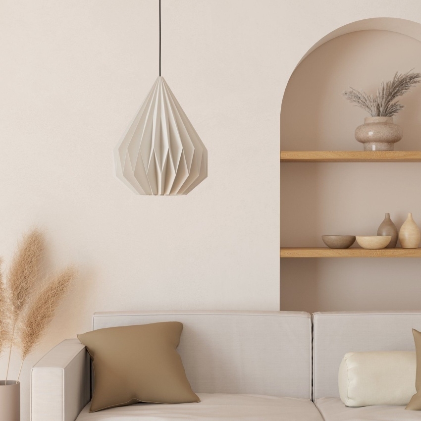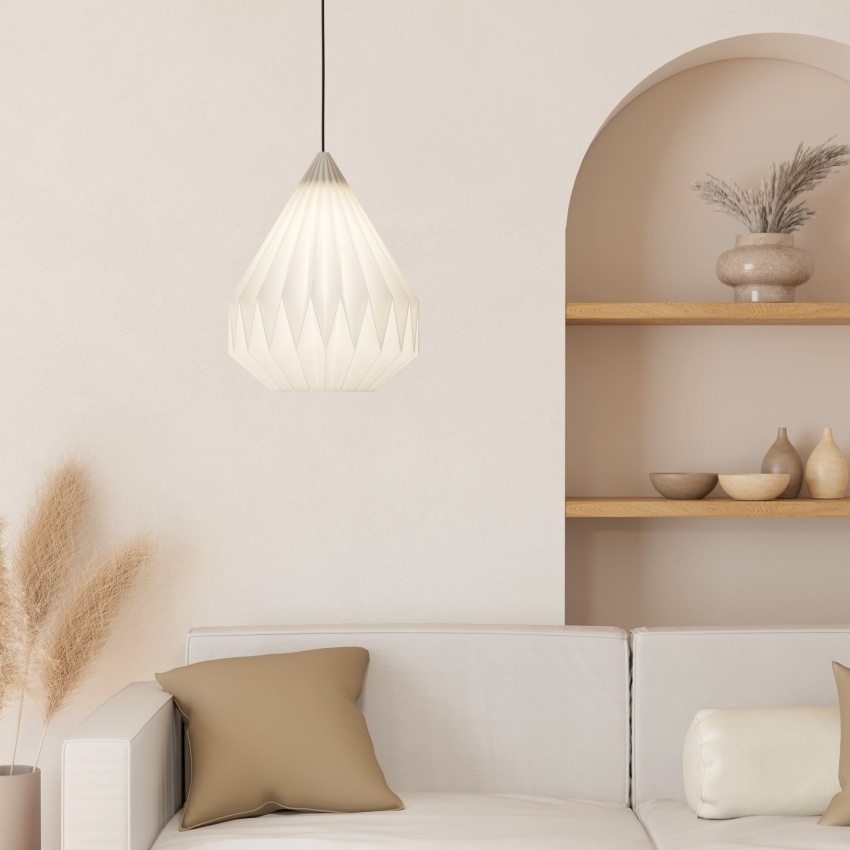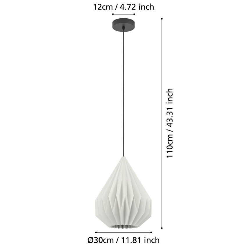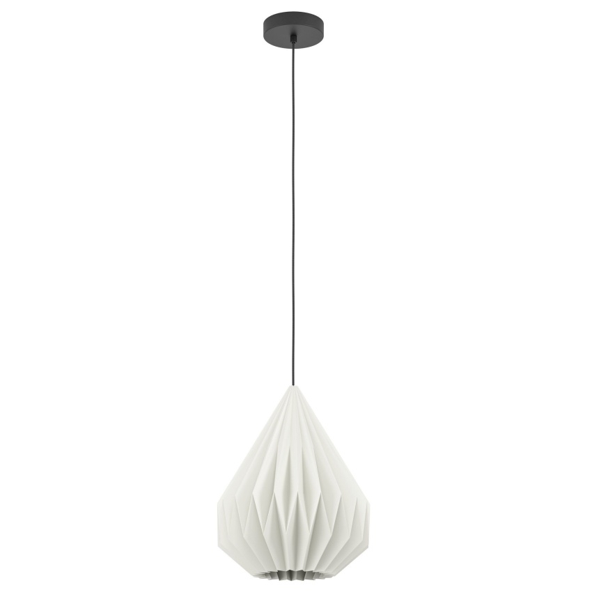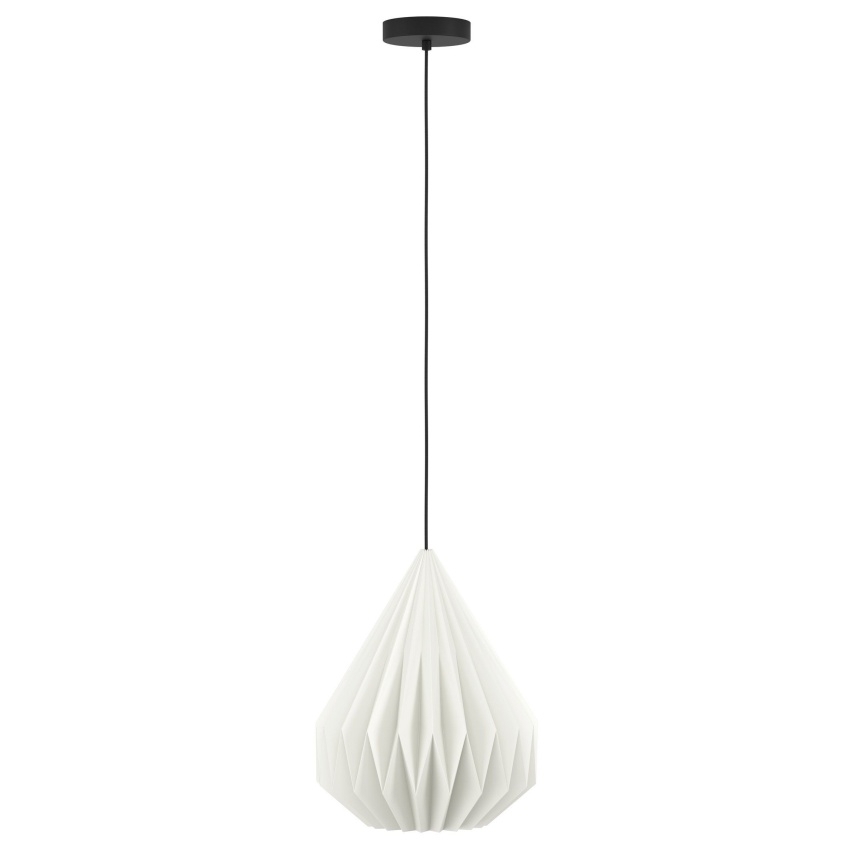 Závěsné svítidlo MINTING 43932 přináší do interiéru lehkost a příjemnou atmosféru. Stínidlo z bílého skládaného papíru ve tvaru slzy je doplněno o černý kovový závěs, který vytváří elegantní kontrast. Díky spodnímu otvoru stínidla s průměrem 30 cm je světlo směrováno přímo na stůl nebo plochu pod svítidlem. Toto svítidlo je ideální pro osvětlení kuchyní, jídelen nebo obývacích pokojů. Je určeno pro žárovku s paticí E27 a maximálním výkonem 25 W, která není součástí balení, což vám umožní zvolit světelný zdroj podle vašich preferencí.