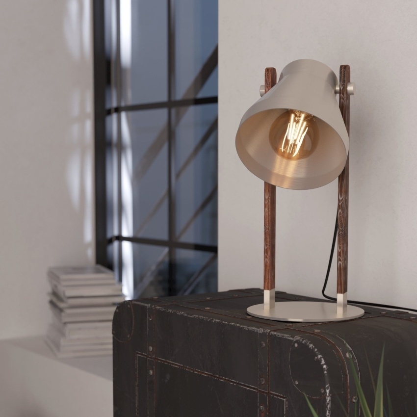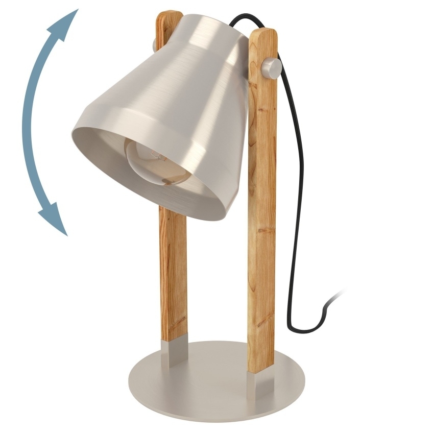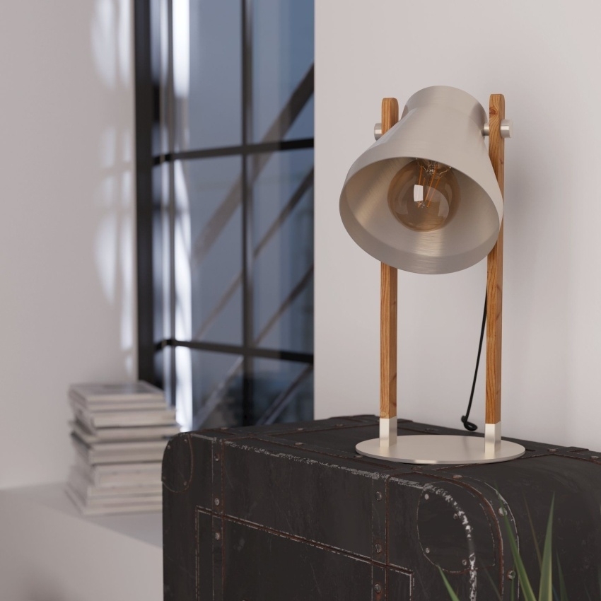 Stolní lampa CAWTON 43953 kombinuje přírodní vzhled páleného dřeva s kovovými prvky v krémové barvě. Je vybavena stabilní dvounohou základnou a otočným stínidlem z matné oceli, které umožňuje nastavit směr světla podle potřeby. Povrch stínidla vytváří jemný kovový efekt, který dodává lampě elegantní a moderní charakter. Lampa je praktická díky jednoduchému ovládání pomocí vypínače umístěného na kabelu. Skvěle se hodí do ložnice na noční stolek, do obývacího pokoje, jídelny nebo předsíně. Je určena pro žárovku s paticí E27 a maximálním výkonem 40 W, která není součástí balení.