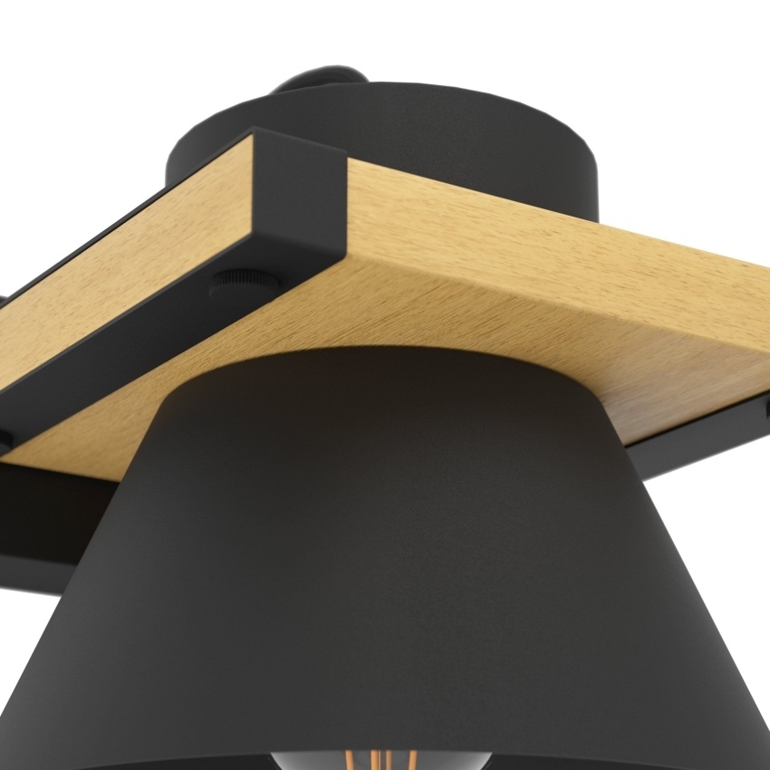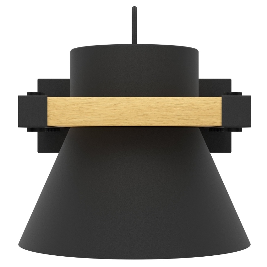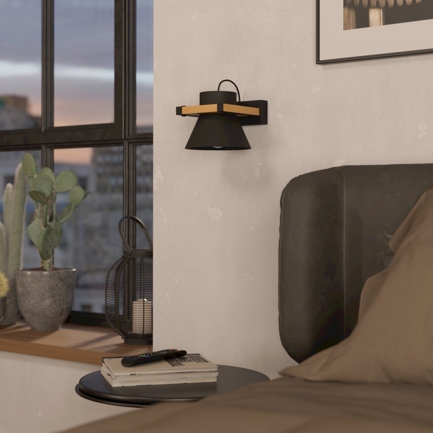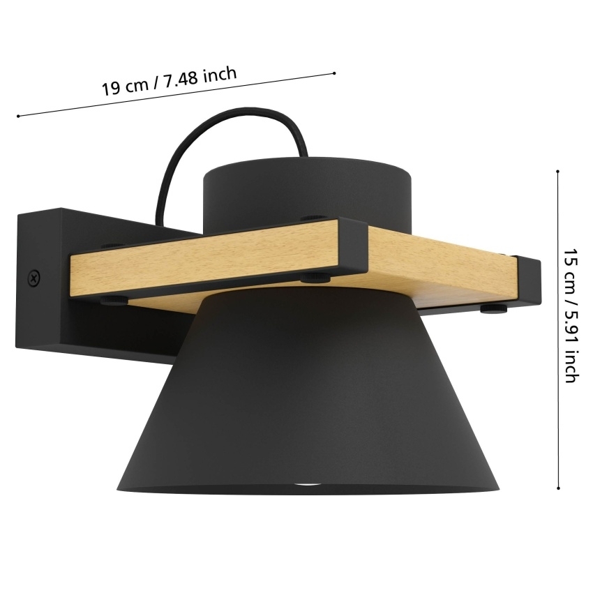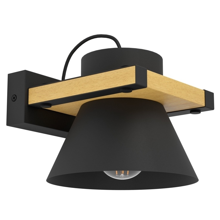 Nástěnné svítidlo EGLO MACCLES 43958 s kombinací černého kovu a přírodního dřeva, ideální pro moderní interiéry v industriálním stylu.
