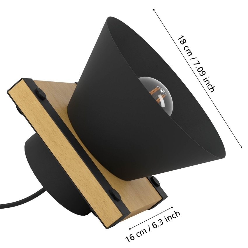 Stolní lampa MACCLES 43959 vyniká originálním vzhledem, který spojuje přírodní dřevo a černý kov. Kovové stínidlo je elegantně zasazeno do dřevěné desky a doplněno o kovové prvky, které podtrhují industriální charakter svítidla. Tento trendový mix materiálů přináší do interiéru jedinečný prvek, který se skvěle hodí na pracovní stůl, noční stolek nebo příruční stolek v obývacím pokoji. Lampa se pohodlně ovládá pomocí vypínače umístěného na kabelu. Je určena pro žárovku s paticí E27 a maximálním výkonem 15 W, která není součástí balení, což vám umožňuje zvolit světelný zdroj podle vašich potřeb.
