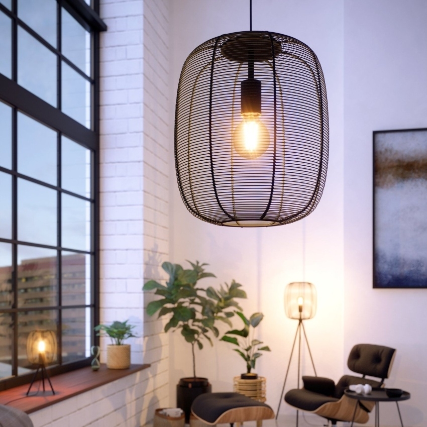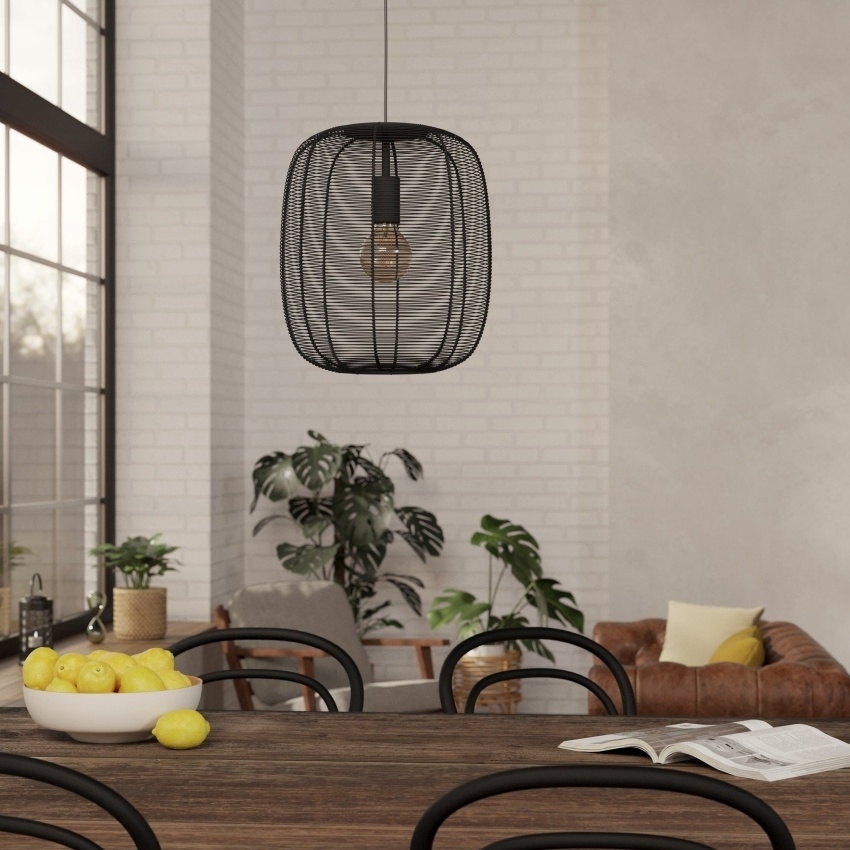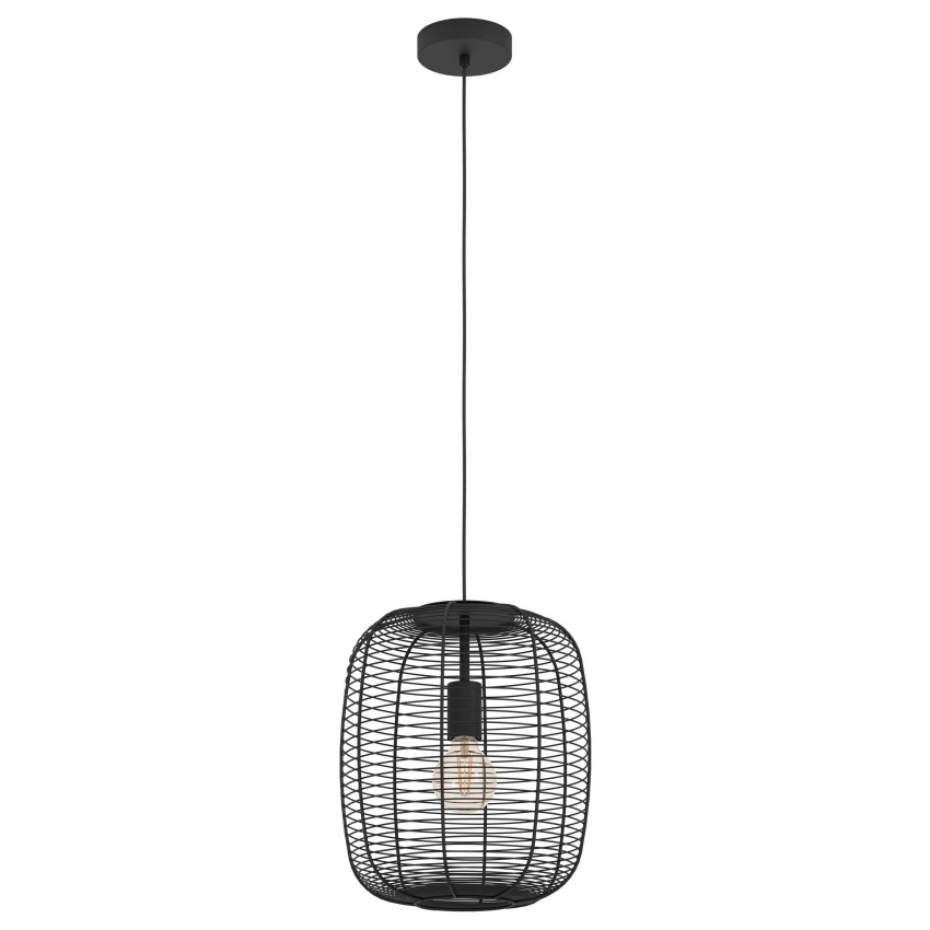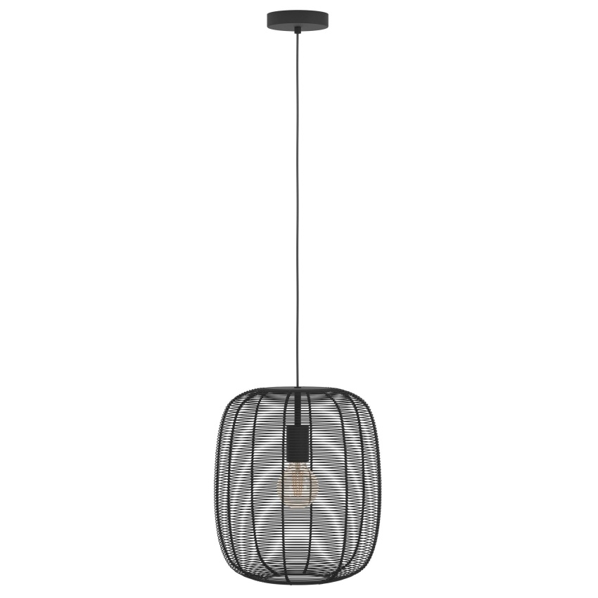Závěsné svítidlo EGLO RINROE 43965 s elegantním kovovým stínidlem z černého vinutého drátu, ideální pro moderní i vintage interiéry.