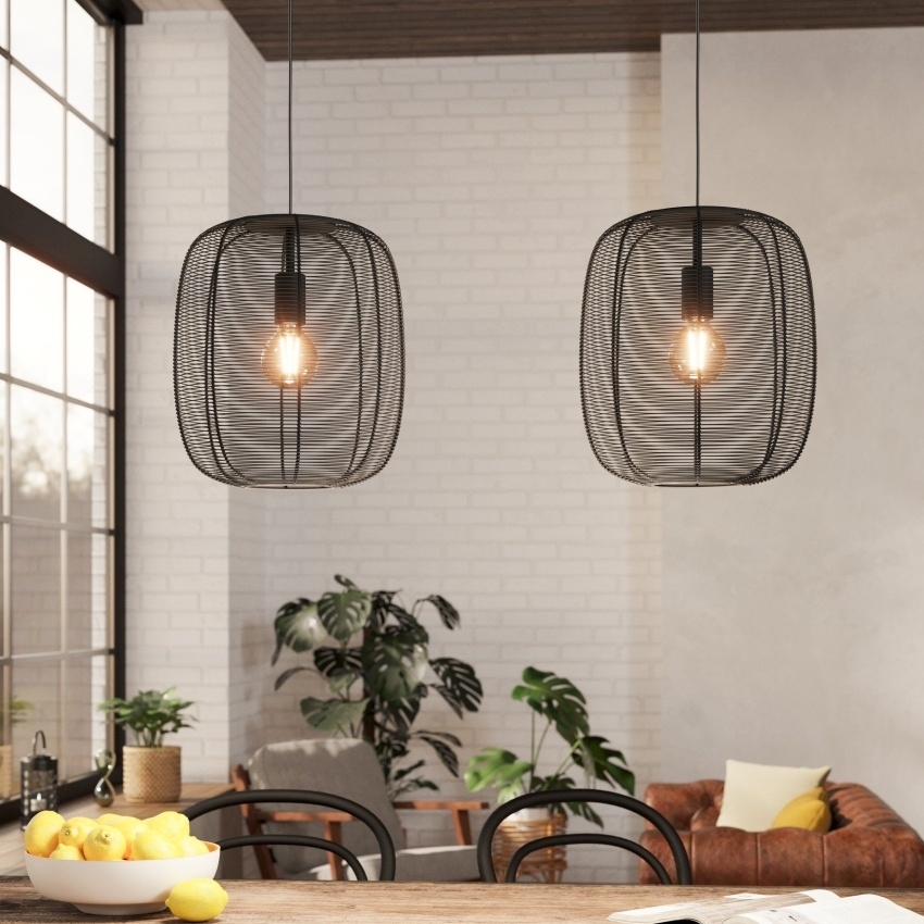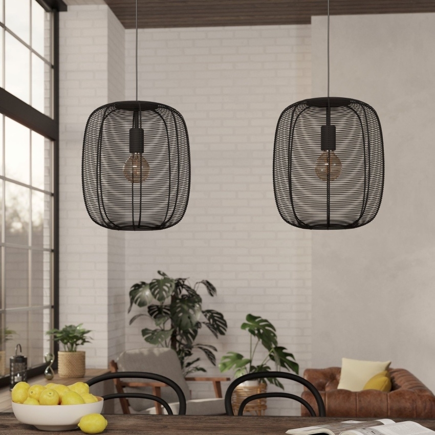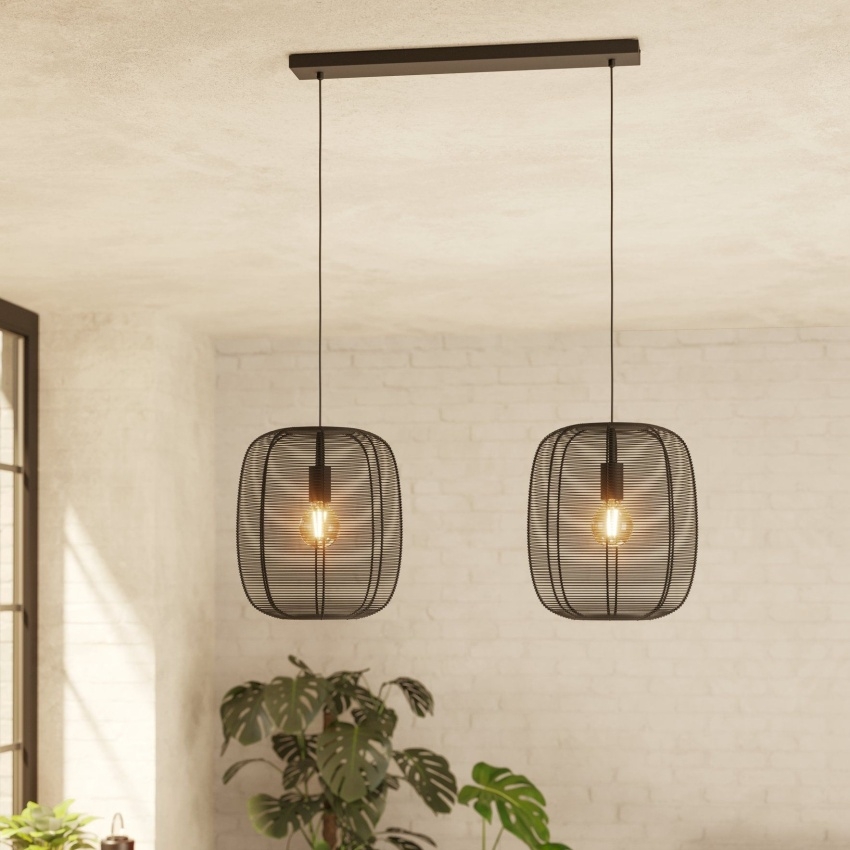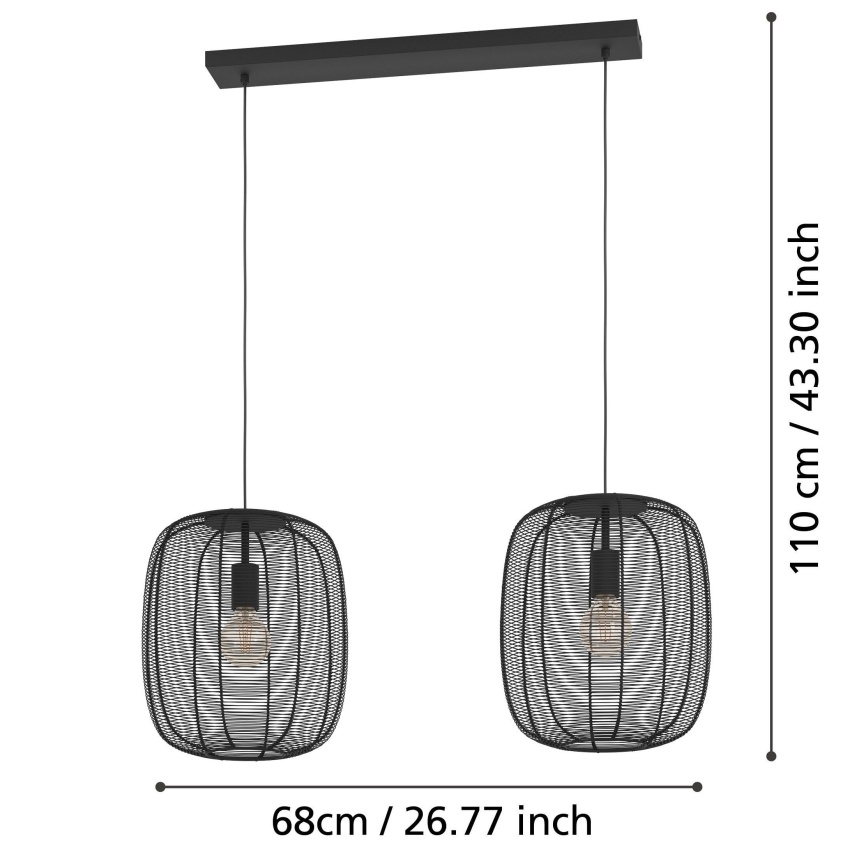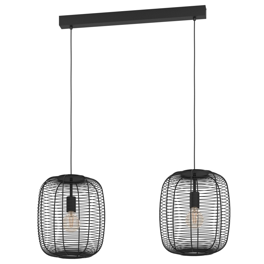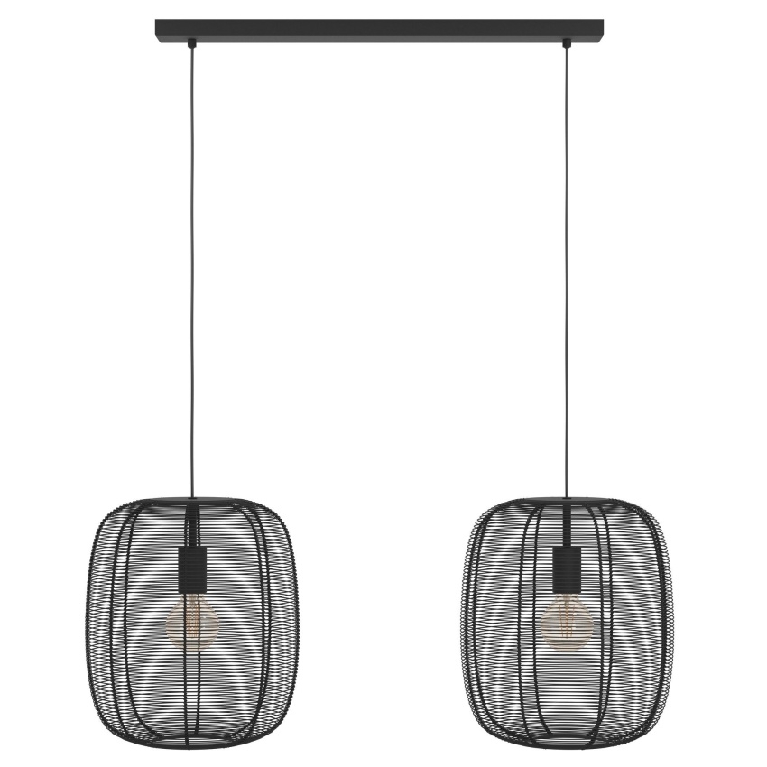 Závěsné svítidlo EGLO RINROE 43966 s dvěma kovovými stínidly z černého vinutého drátu, ideální pro moderní i vintage interiéry.