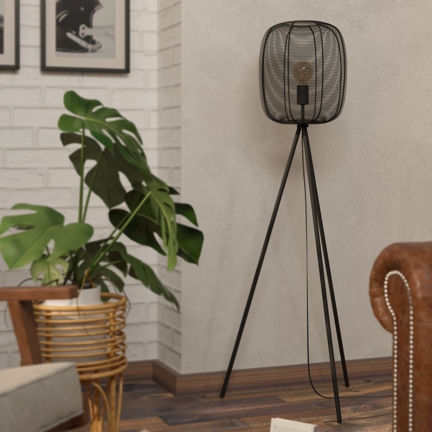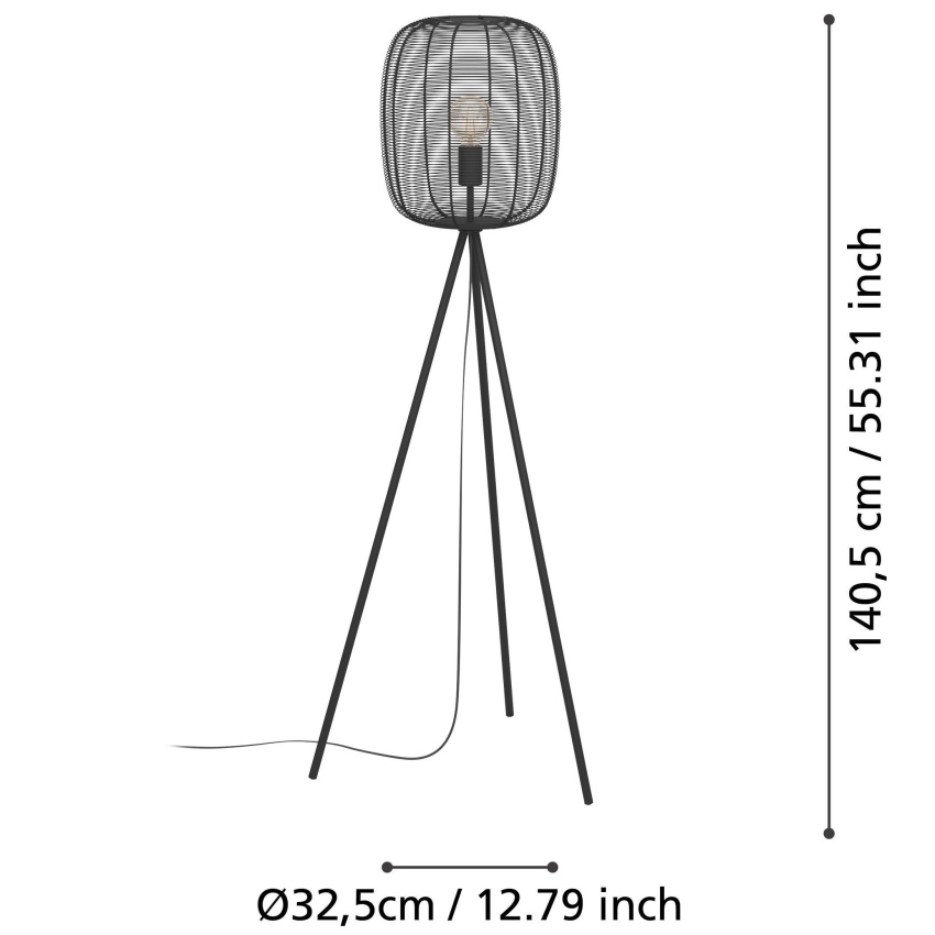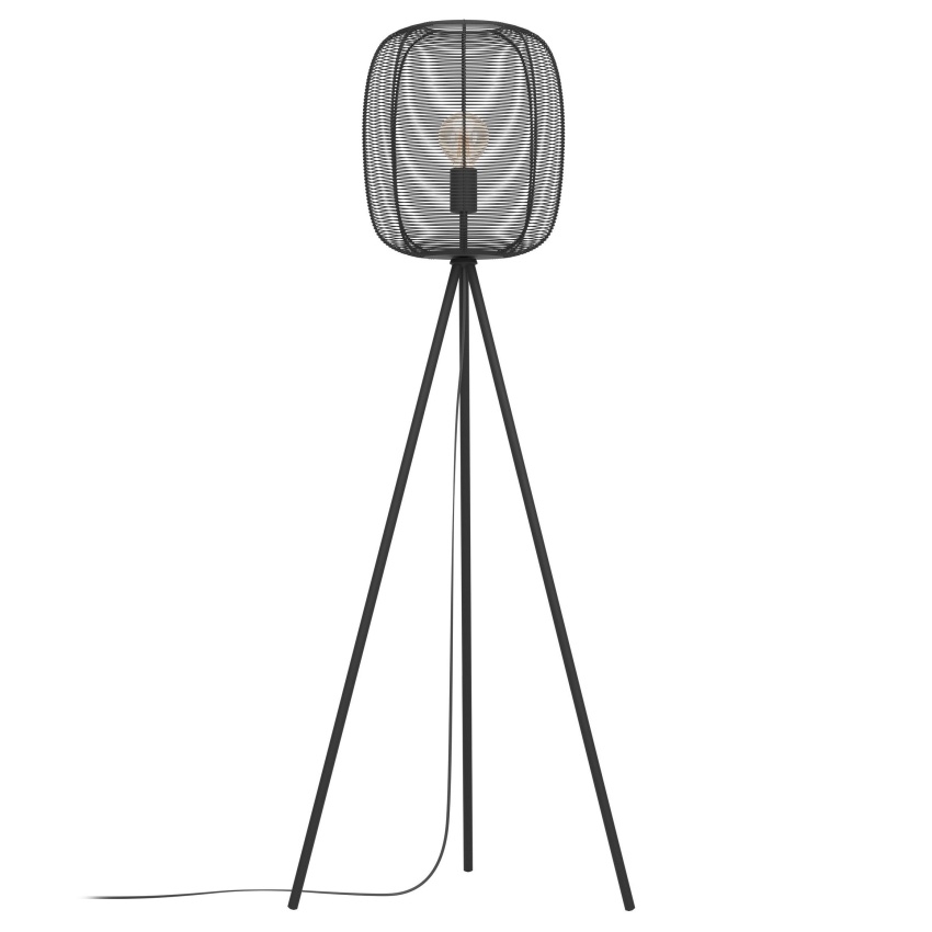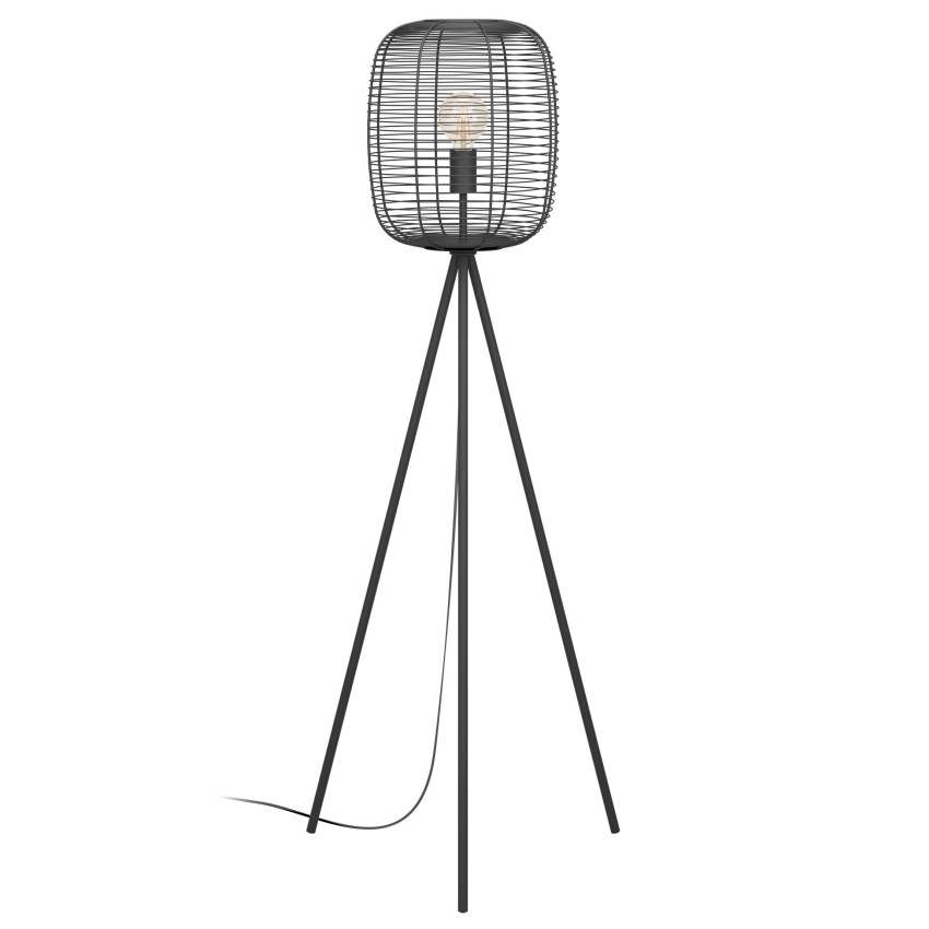 Stojací svítidlo EGLO RINROE 43968 s elegantním kovovým stínidlem z černého vinutého drátu a stabilní třínohou základnou, ideální pro moderní i vintage interiéry.