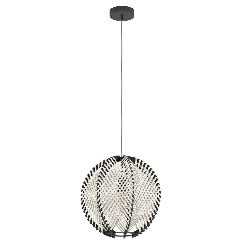 Závěsné svítidlo EGLO WAVERTON 44005 s textilním stínidlem a černým dřevěným rámem, ideální pro moderní interiéry s přírodním nádechem.
