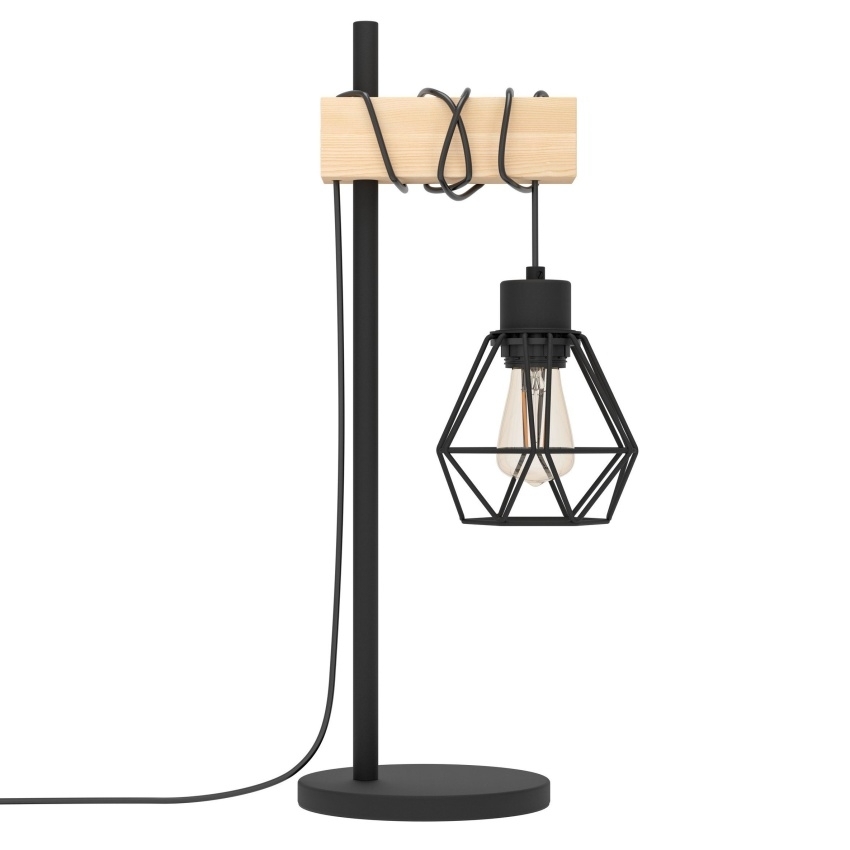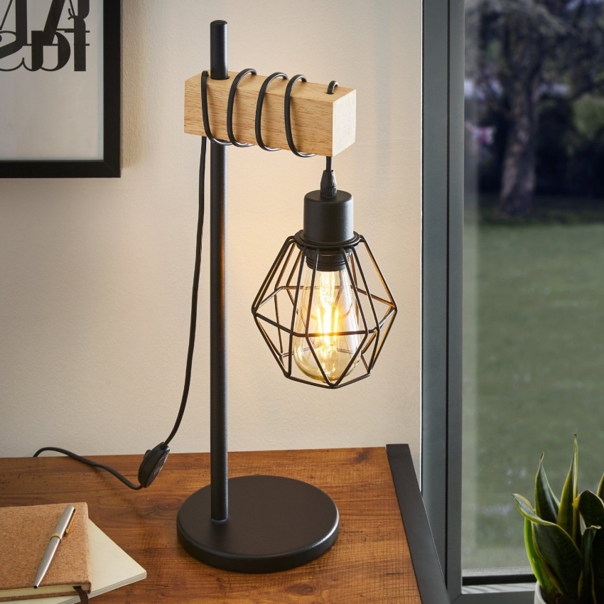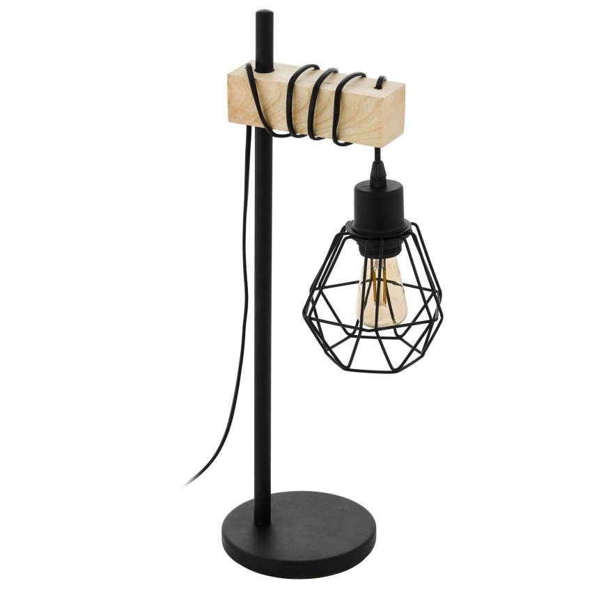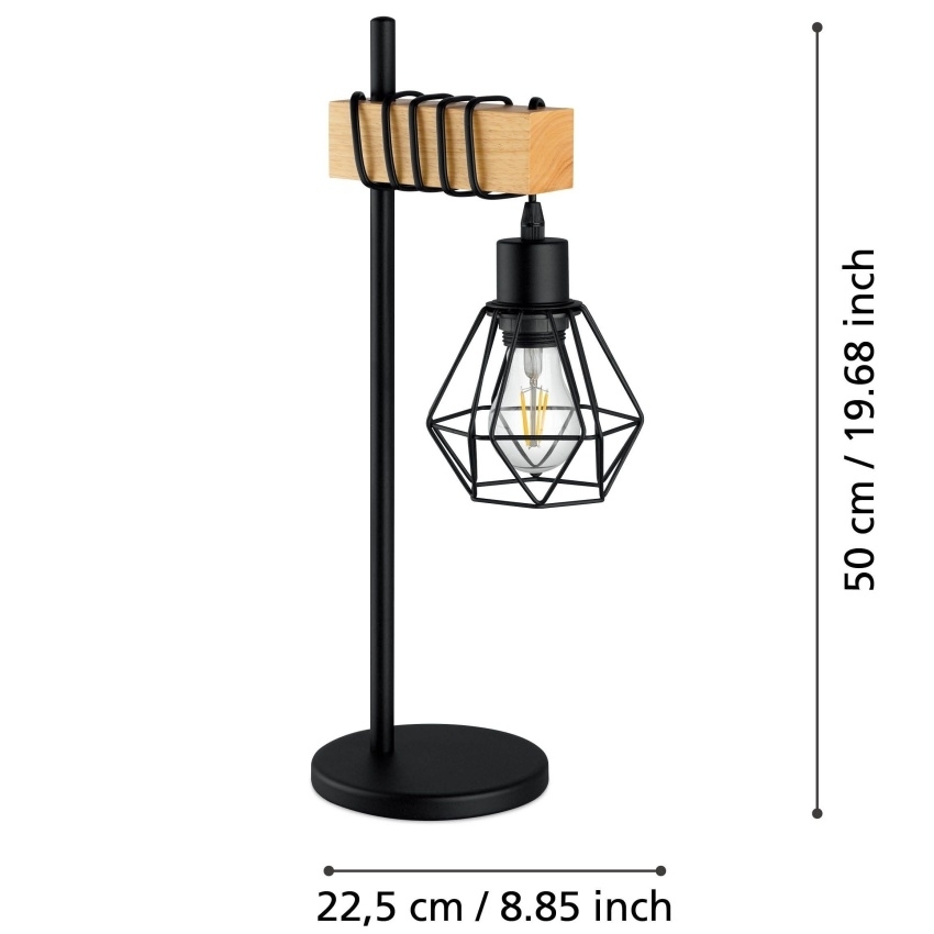 Stolní svítidlo EGLO TOWNSHEND 5 44079 s kombinací černého kovu a přírodního dřeva, ideální jako stylový doplněk do moderních i industriálních interiérů.