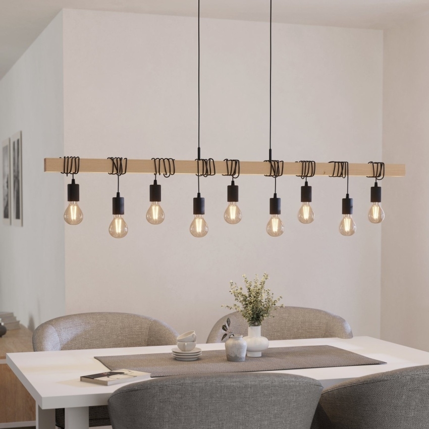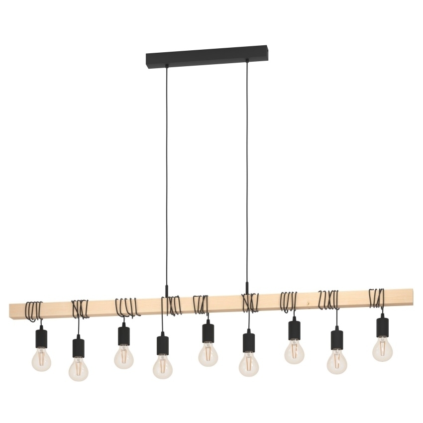 Závěsné svítidlo TOWNSHEND 44099 kombinuje černou ocel a FSC certifikované dřevo borovice, čímž vytváří výrazný industriální vzhled. Devět patic E27 poskytuje dostatek světla i pro větší prostory, což oceníte například v obývacím pokoji, nad jídelním stolem nebo v moderní kuchyni. Díky otevřenému designu je ideální pro použití dekorativních žárovek, které se stanou součástí celkového designu. Žárovky nejsou součástí balení, což umožňuje přizpůsobit vzhled i intenzitu světla vašim potřebám.