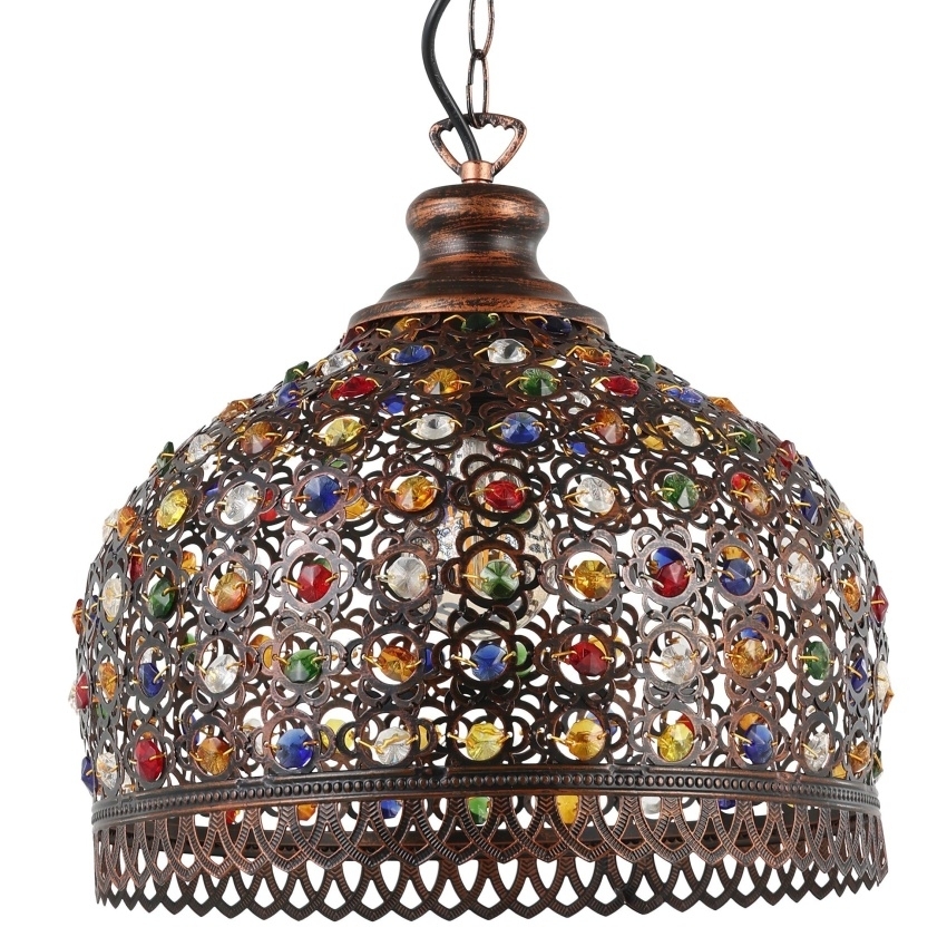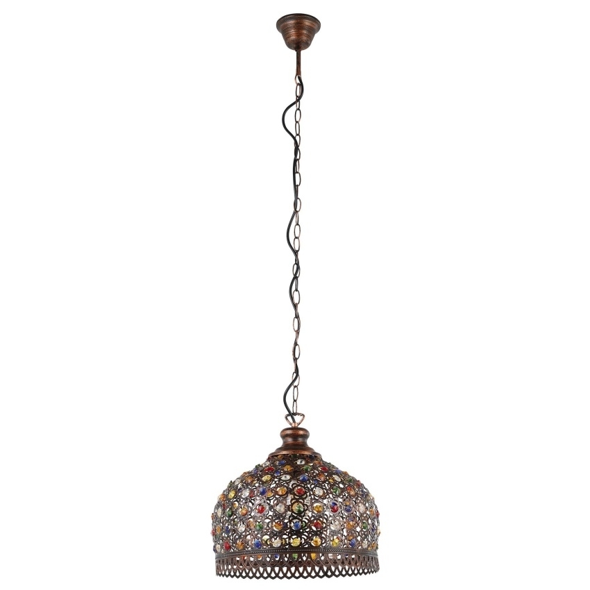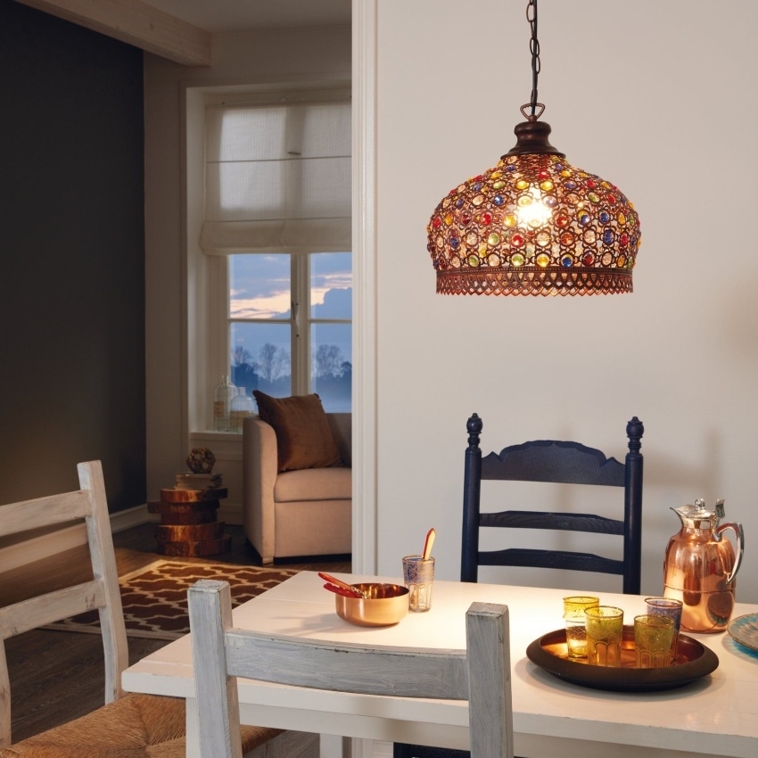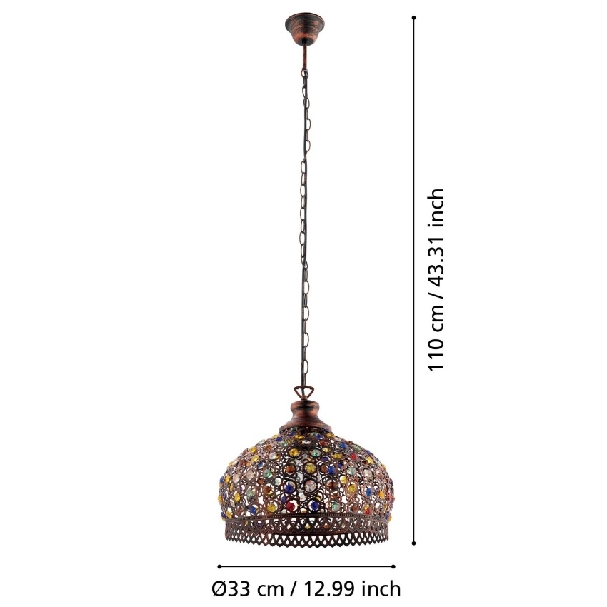 Závěsné svítidlo EGLO JADIDA 49764 v orientálním stylu s pestrobarevnými sklíčky a anticky měděným provedením.
