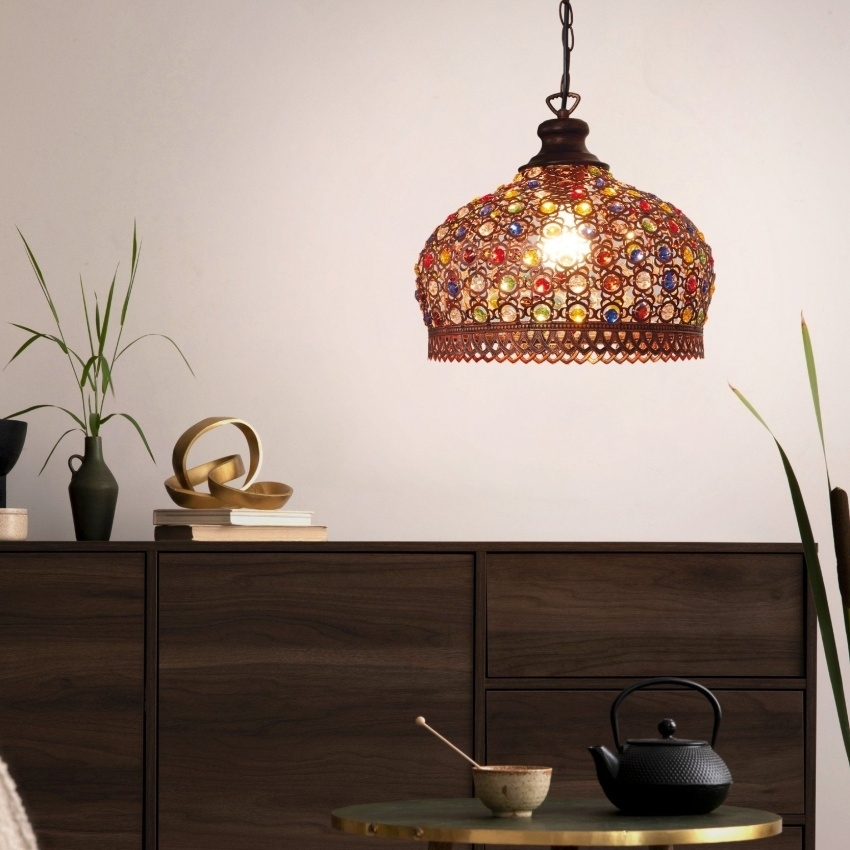 Závěsné svítidlo JADIDA 49764 vnese do vašeho interiéru nádech Orientu a luxusu jako z Pohádky tisíce a jedné noci. Elegantní stínidlo v měděném antickém designu je zdobeno pestrobarevnými sklíčky, které po rozsvícení vytvářejí úchvatnou hru světel a barev. Toto svítidlo se hodí do ložnice, obývacího pokoje, vstupní haly či na schodiště a uplatní se také v kavárnách, čajovnách nebo relaxačních a masážních prostorách. Žárovka není součástí balení, což vám umožní vybrat světelný zdroj dle vlastních preferencí.