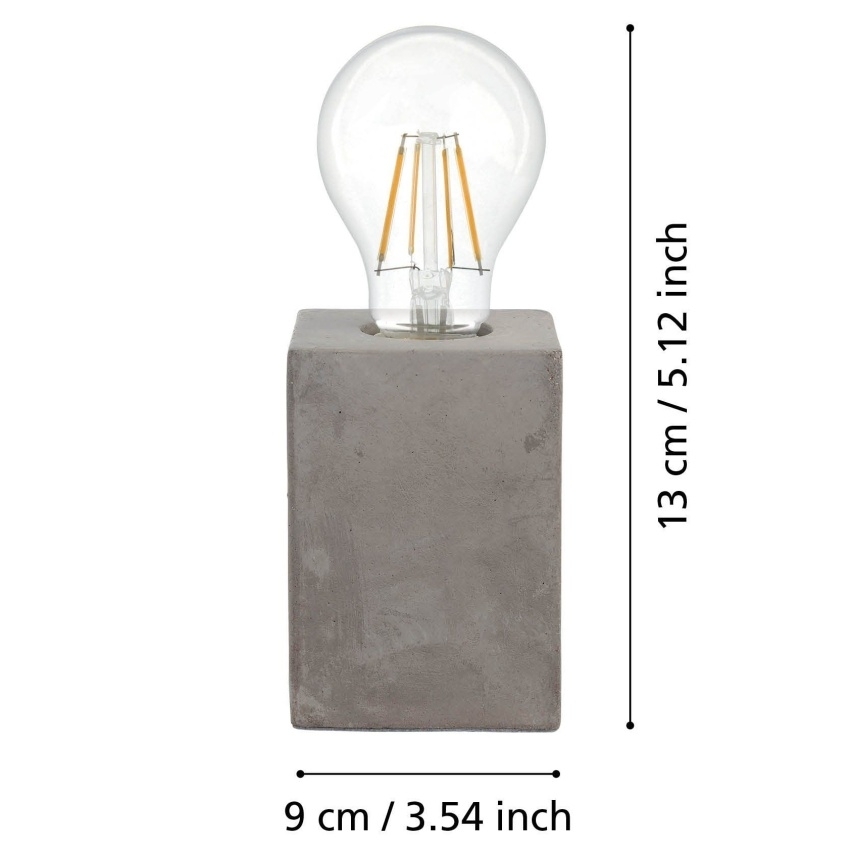 Stolní lampa PRESTWICK 49812 zaujme minimalistickým designem s nádechem industriálního stylu. Její základna ve tvaru šedé keramické kostky připomínající beton vytváří originální a moderní vzhled. Lampa je navržena pro volně stojící žárovku, což jí dodává jedinečný charakter. Díky svému jednoduchému a rustikálnímu provedení se hodí do různých prostor – ložnice, obývacího pokoje, jídelny či předsíně. Ovládání je snadné pomocí praktického vypínače na kabelu. Žárovka není součástí balení, což vám umožňuje vybrat světelný zdroj dle vlastních preferencí.