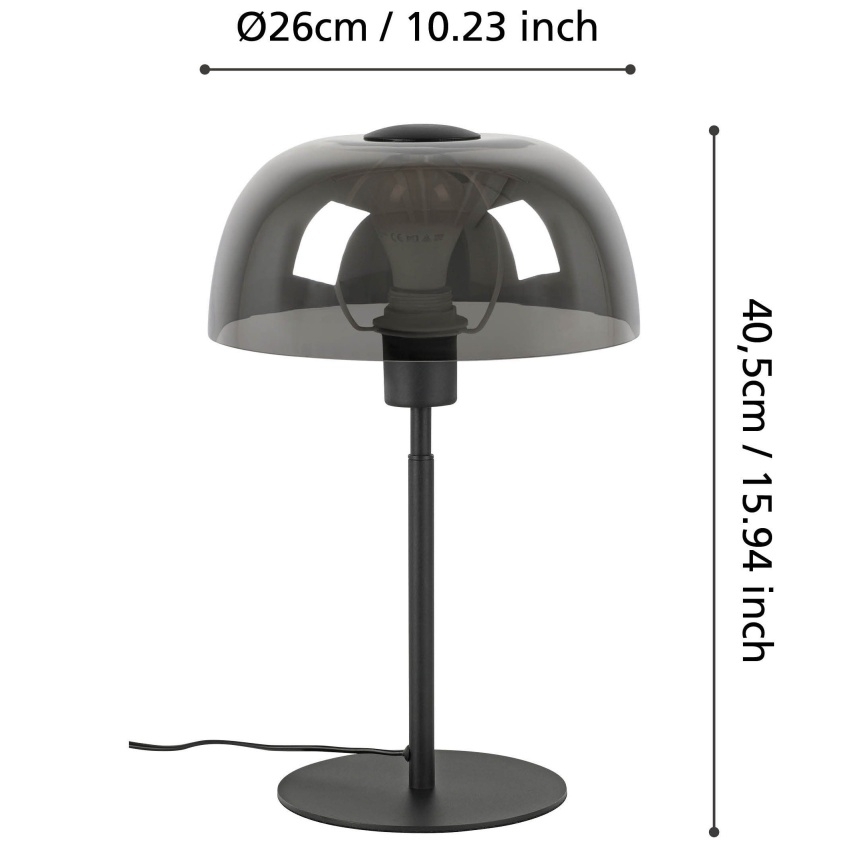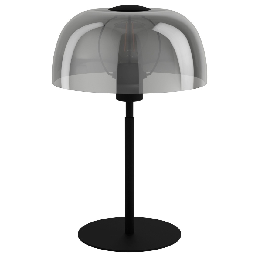 Stolní svítidlo EGLO SOLO 2 s paticí E27, černý kovový podstavec a kulaté kouřové skleněné stínidlo pro elegantní a moderní osvětlení.