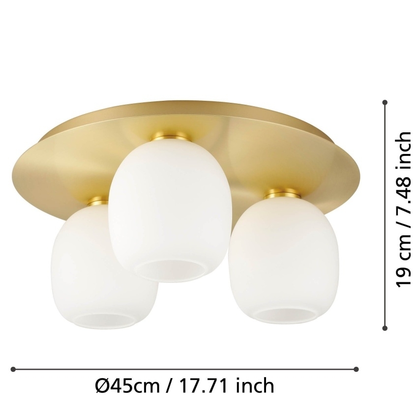 Stropní svítidlo MANZANARES zaujme svým moderním a čistým designem. Skládá se z kulaté základny z broušené mosazi a tří jemně zaoblených stínidel z bílého opálového matného skla. Díky neutrálním barvám a elegantnímu zpracování se snadno začlení do různých interiérů a poskytne příjemné a rovnoměrné osvětlení. Ideální pro použití v kuchyni, obývacím pokoji, ložnici nebo předsíni. Žárovky nejsou součástí balení, což vám umožňuje zvolit si světelný zdroj dle svých potřeb.