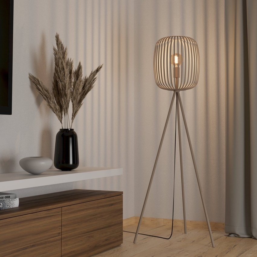 Stojací lampa EGLO ROMAZZINA v pískové barvě s kovovým stínidlem a třínohým podstavcem, vhodná pro žárovku E27.