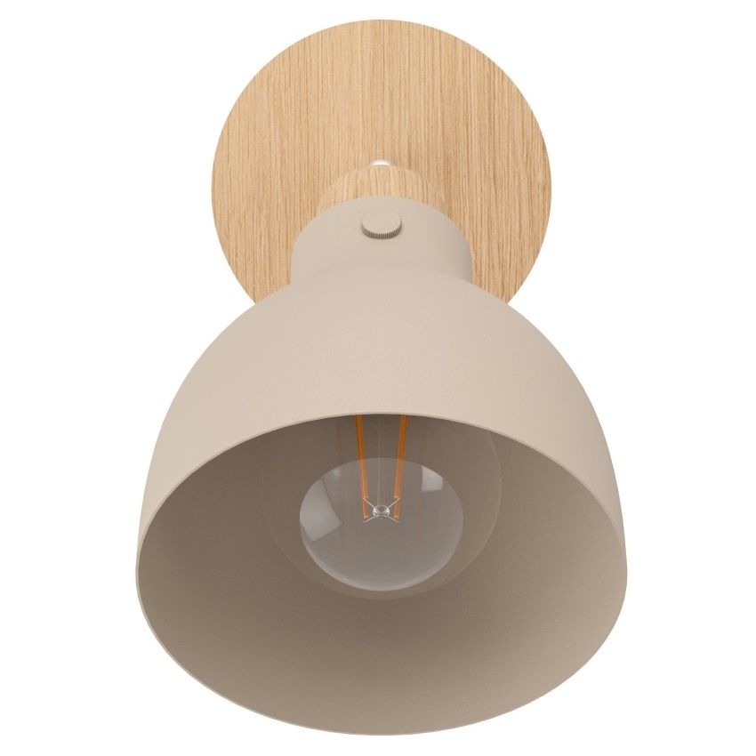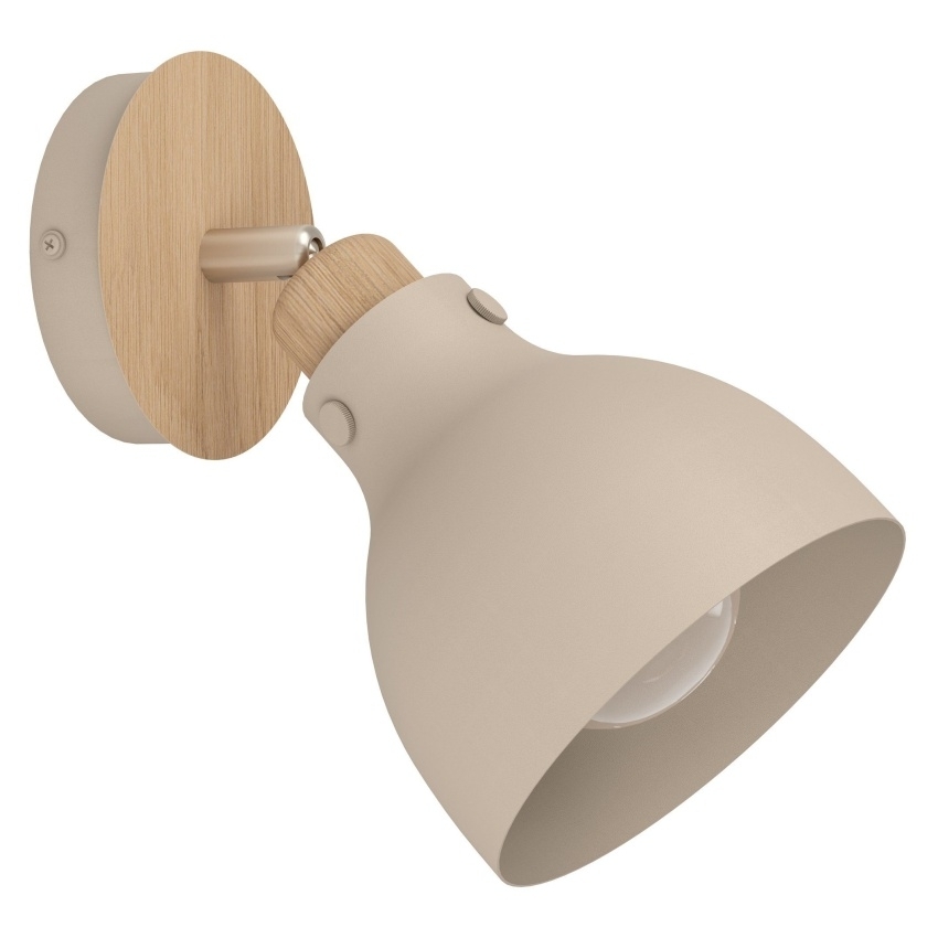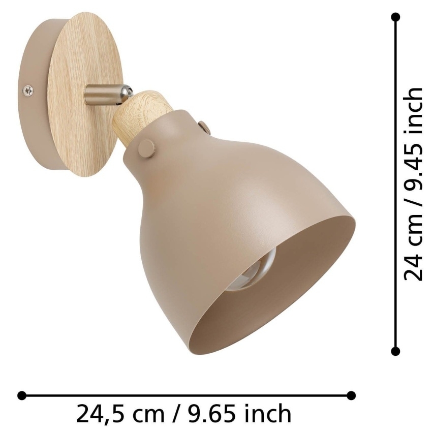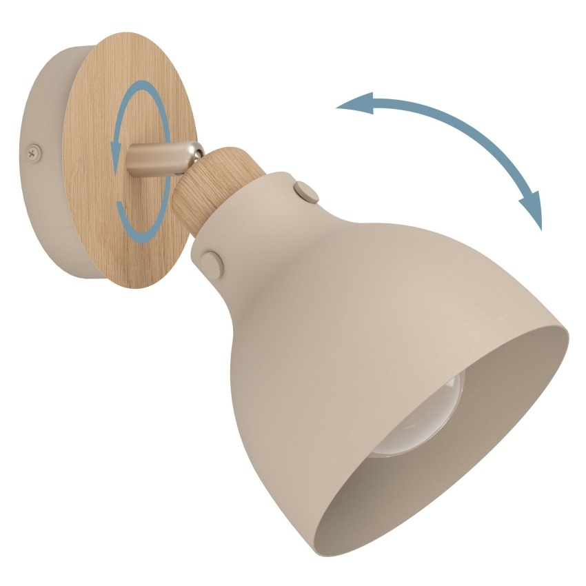 Bodové svítidlo EGLO ARRECIFE kombinuje moderní design s nádechem vintage a industrial stylu. Konstrukce je vyrobena z kovového závěsu ve vzhledu dřeva a doplněna pohyblivým stínidlem v pískové barvě. Díky otočné hlavě lze světlo nasměrovat přesně tam, kde je potřeba, což umožňuje vytvořit individuální světelné akcenty v místnosti. Svítidlo lze použít jako nástěnné i stropní a je vhodné pro různé prostory, jako je obývací pokoj, kuchyně, ložnice, chodba či jídelna. Žárovka není součástí balení a je třeba ji dokoupit samostatně.