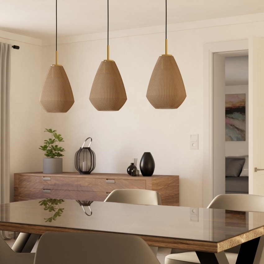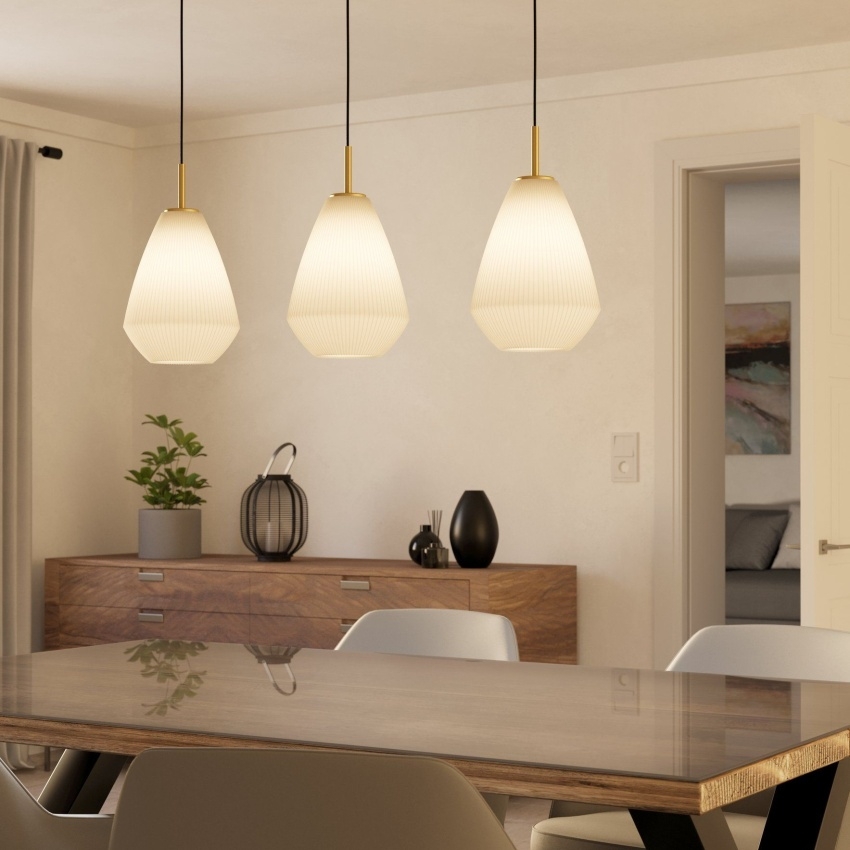 Závěsné svítidlo EGLO CAPRAROLA kombinuje eleganci s moderním stylem a vytváří příjemné a útulné osvětlení interiéru. Skládá se ze tří kónických satinovaných skleněných stínidel v pískové barvě, která jsou zavěšena na podlouhlém kovovém přístřešku v provedení kartáčovaná mosaz. Toto svítidlo je ideální pro osvětlení jídelního stolu, obývacího pokoje nebo dalších obytných prostor. Žárovky nejsou součástí balení, doporučuje se použití opálových žárovek pro jemné a rovnoměrné rozptýlení světla.