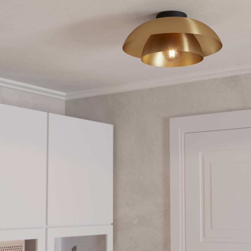 Stropní svítidlo EGLO CENCIARA je luxusním doplňkem pro moderní interiéry. Tvoří jej dvě vnořená kulatá kovová stínidla z broušené mosazi s vnitřní zlatou povrchovou úpravou. Díky otvoru na vnitřním stínidle vzniká jemné nepřímé osvětlení, které dotváří elegantní vzhled svítidla. V kombinaci s černým kovovým vrchlíkem působí svítidlo stylově a stává se atraktivním prvkem v místnosti. Ideální je pro použití v obývacím pokoji, kuchyni, ložnici nebo předsíni. Žárovka s paticí E27 není součástí balení.